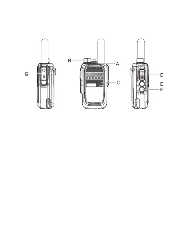 canal/Moniteur | F = Bouton diminution canal/Torche | G = Connecteur