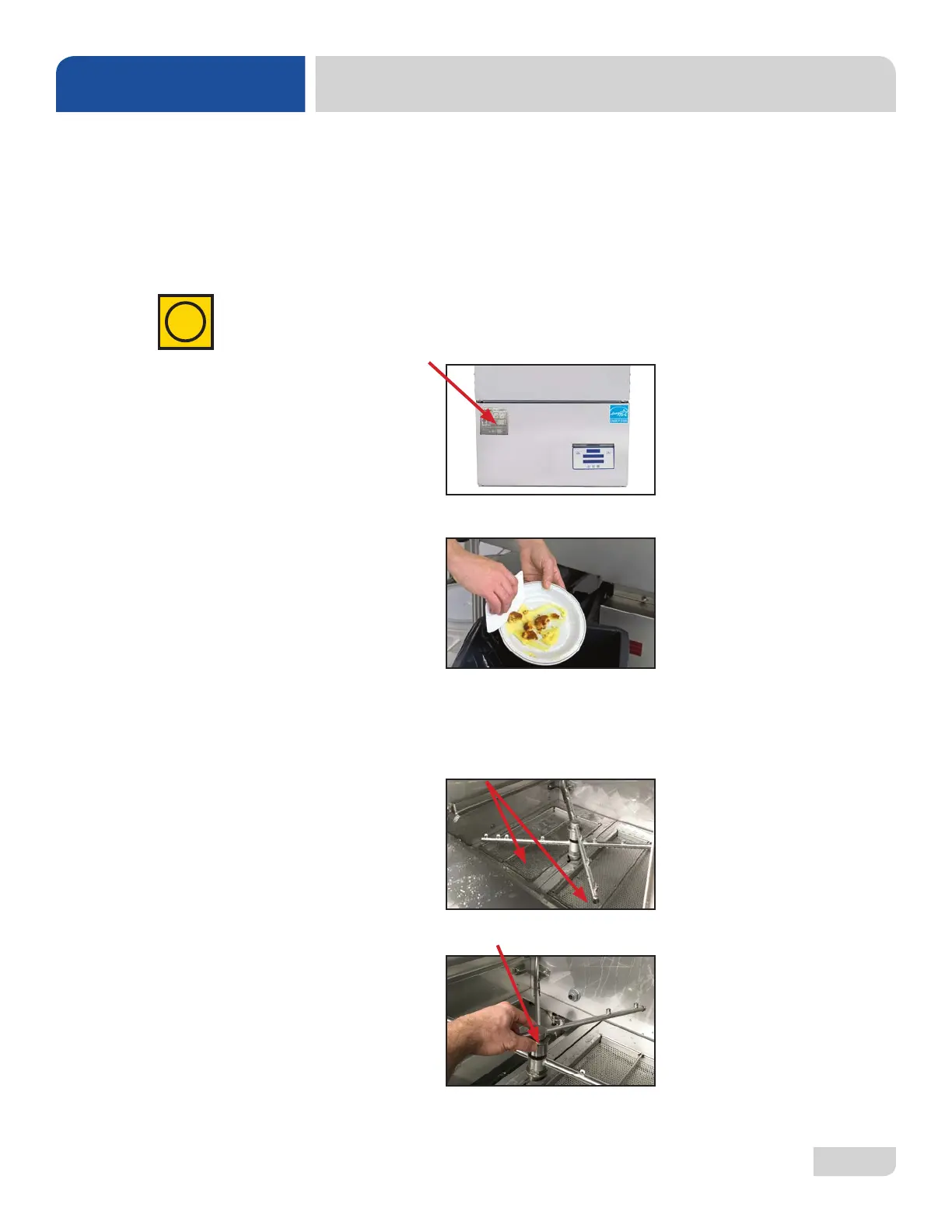 4. Ensure that all wash and rinse arms are secure in the machine before operating.