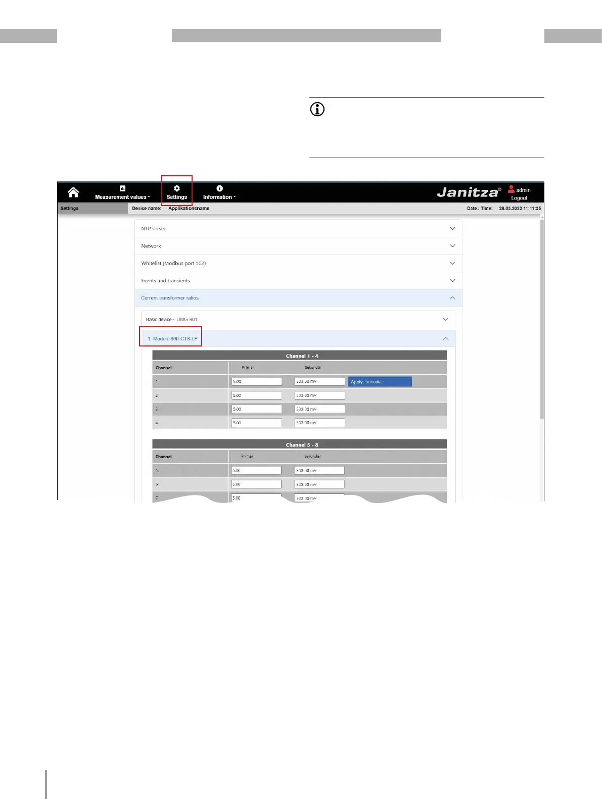 Fig. LP current transformer configuration "Module 1" (800-CT8-LP) using the example of the device homepage of the basic device.