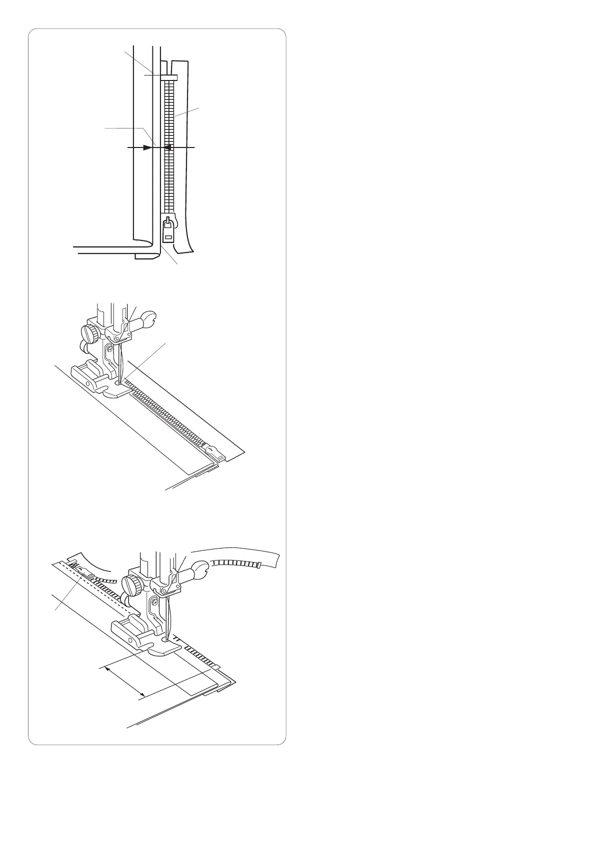 Stop 5 cm (2”) before zipper foot E reaches the slider