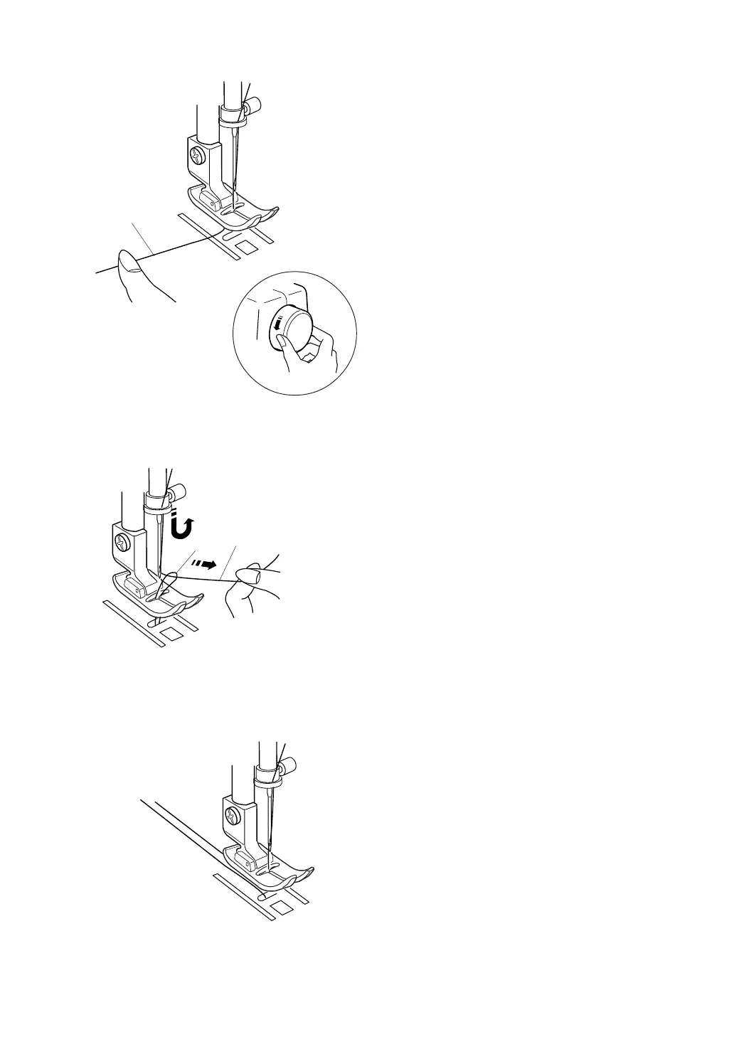 Raise the presser foot. Hold the needle thread