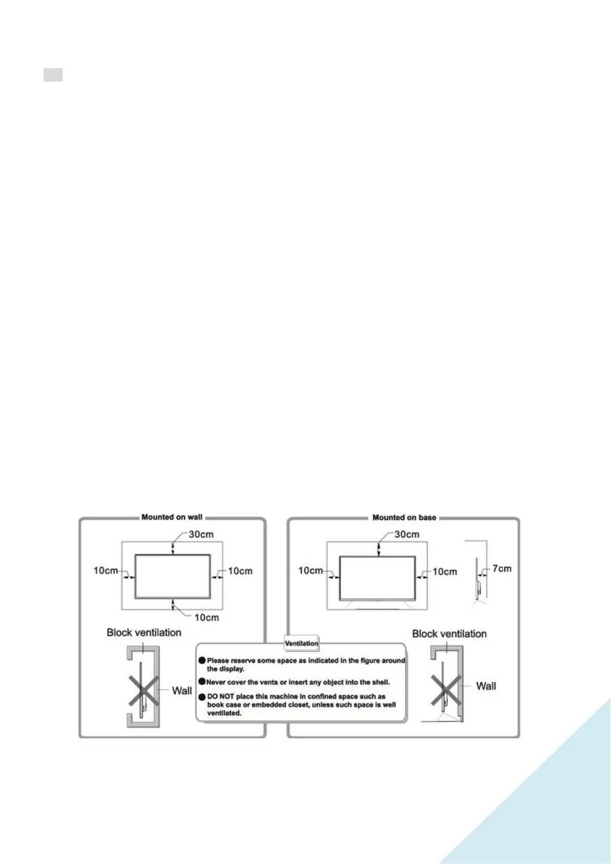 • DO NOT introduce water or foreign substance in the monitor, keep a safe distance (at least 10cm) from other