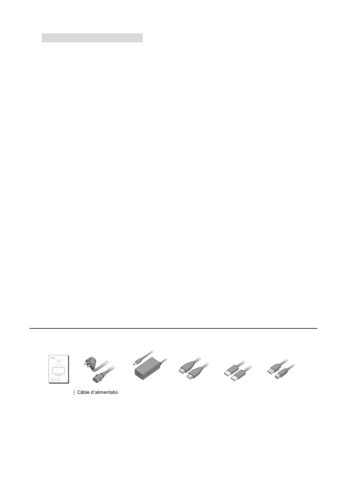 Manuel | Câble d'alimentation | Adaptateur secteur | Câble HDMI | Câble de type C | Câble USB B-A
