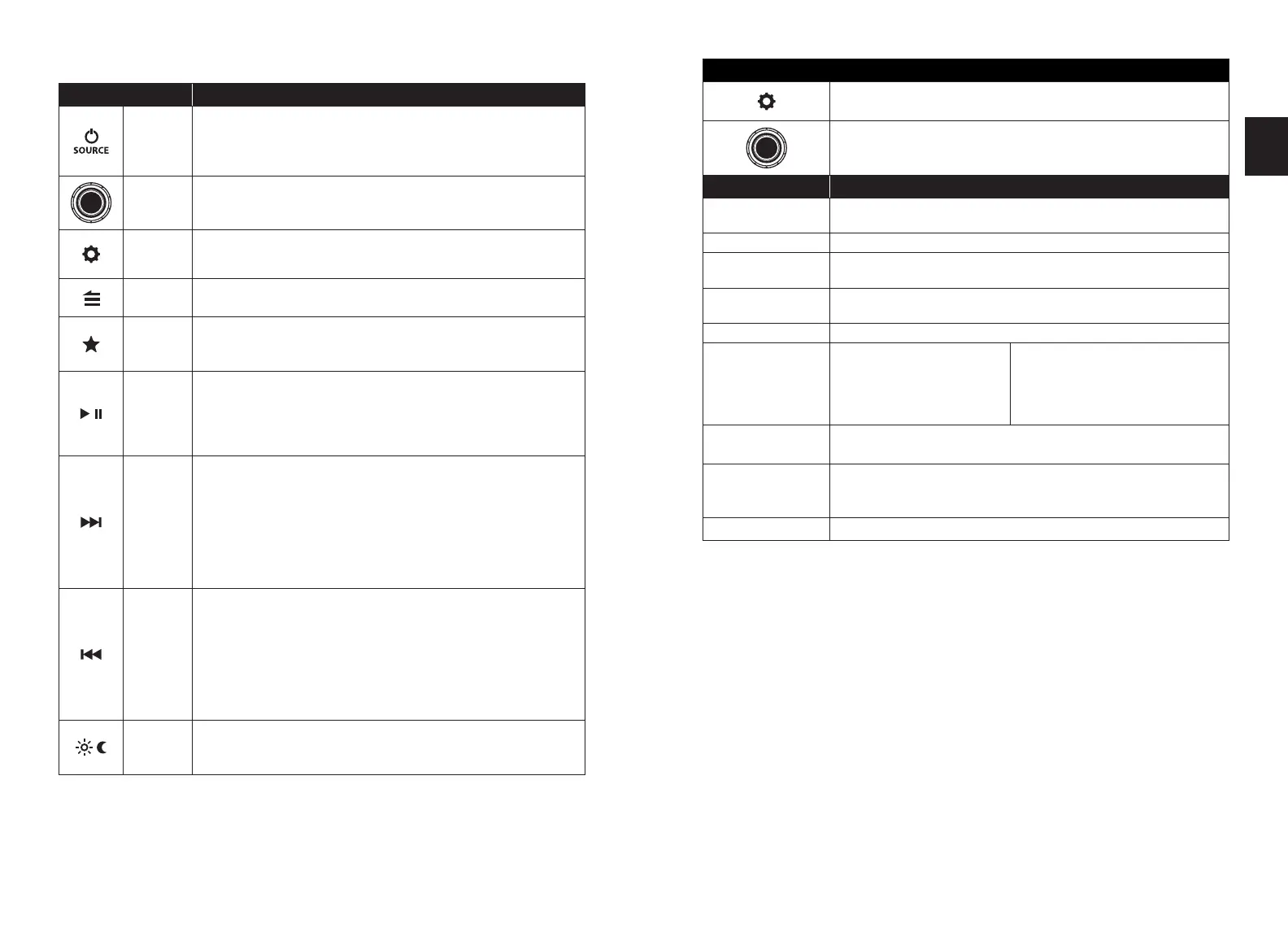 • Chercher la chaîne précédente (FM); sauter dix étapes de fréquence