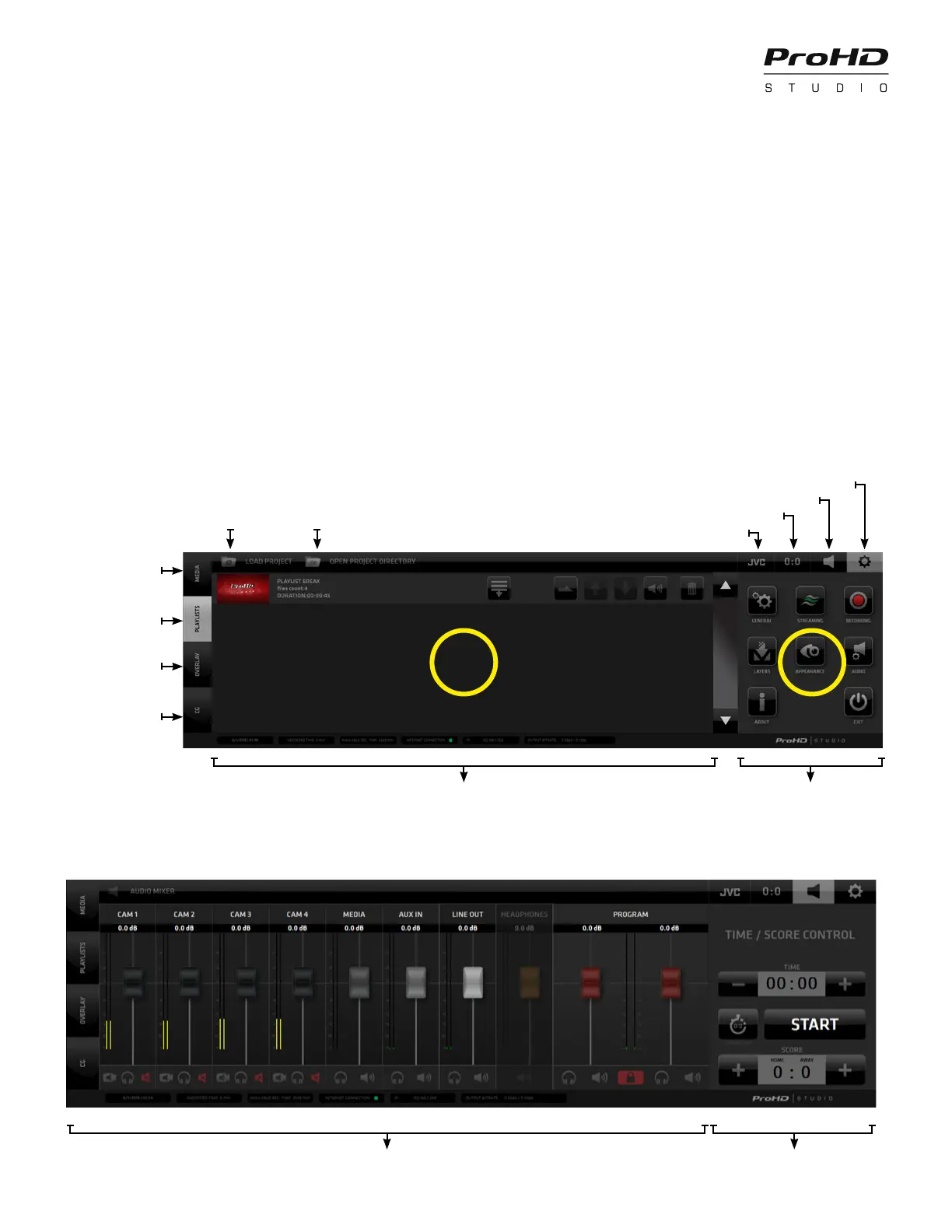This section contains all the control elements of the many functionalities available in ProHD Studio.