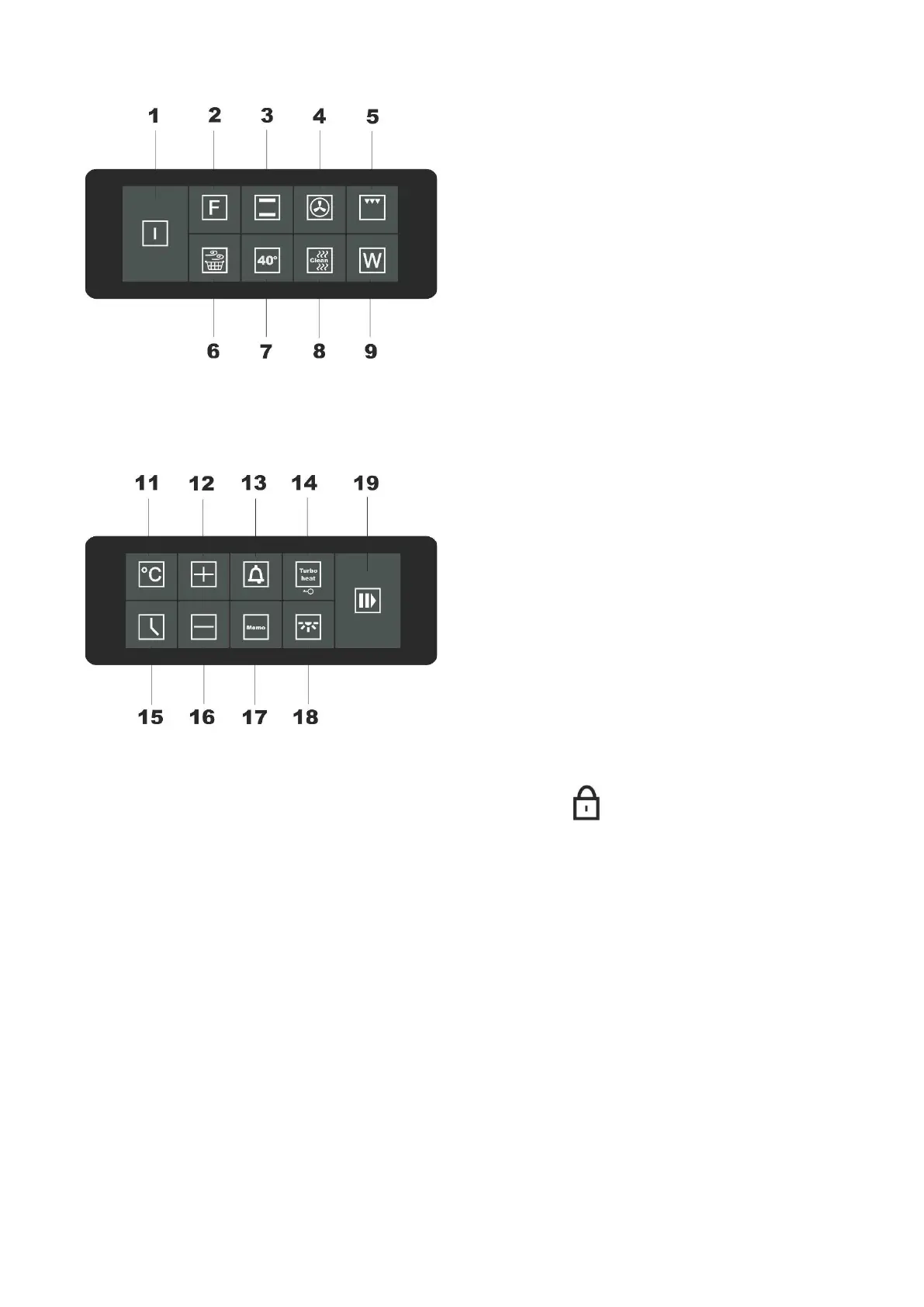 To lock the oven, press button 14 for 3 seconds.