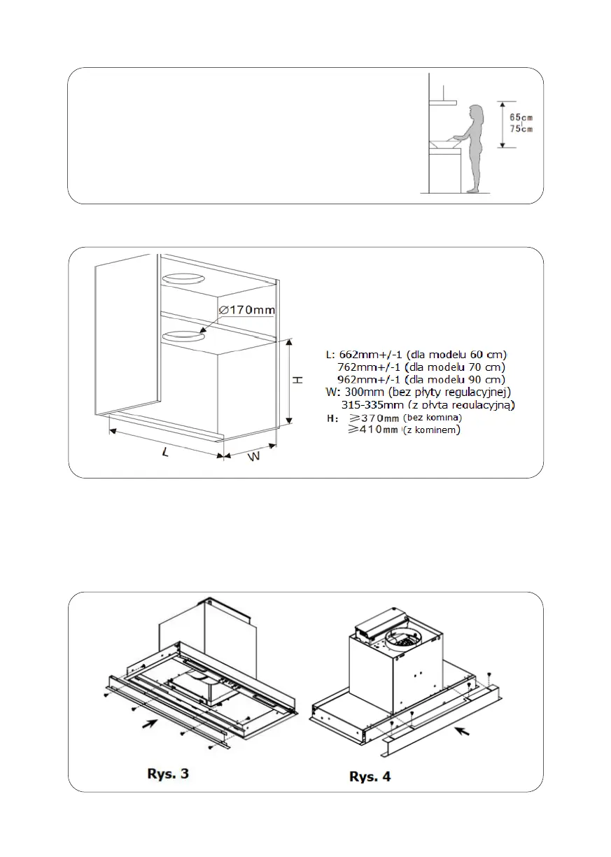 umieszczony w odległości 65~75 cm nad powierzchnią gotowania.