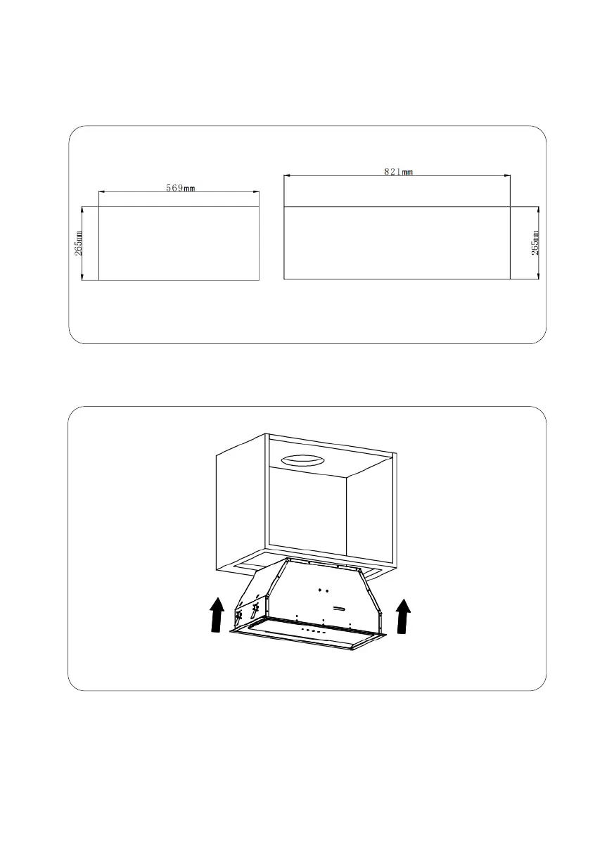 1. Wywierć otwór w szafce o szerokości 569*265(mm)dla modelu 60CM oraz otwór o szerokości