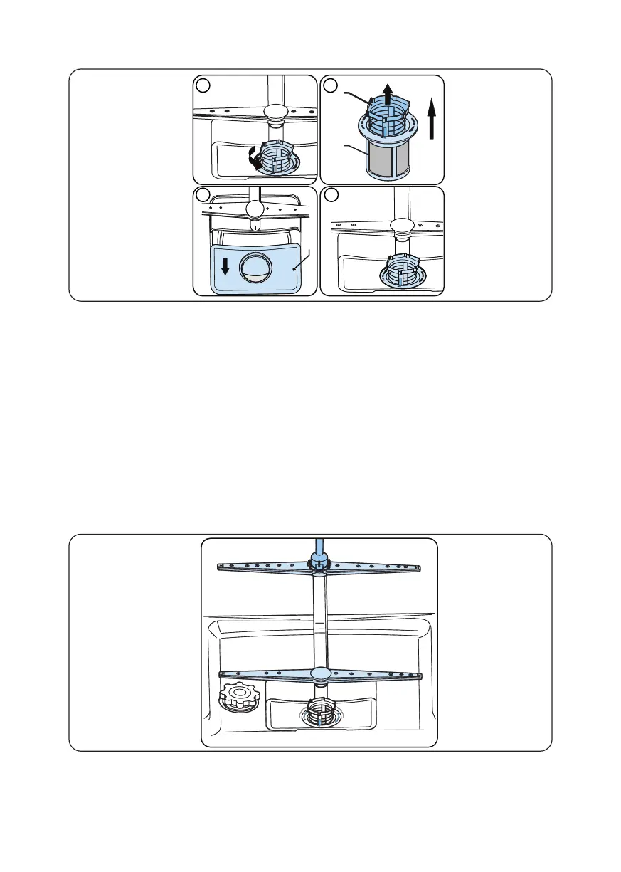 Aby wyjąć i wyczyścić złączone filtry, obróć je w lewo i wyciągnij w górę (1).Wyjmij filtr gruboziarnisty
