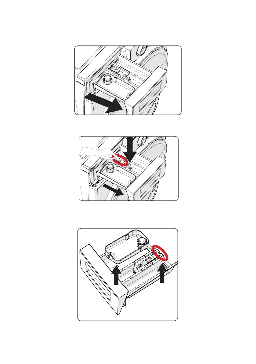 Nacisnąć przedstawiony poniżej obszar wewnątrz wyciągniętej szuflady na detergenty