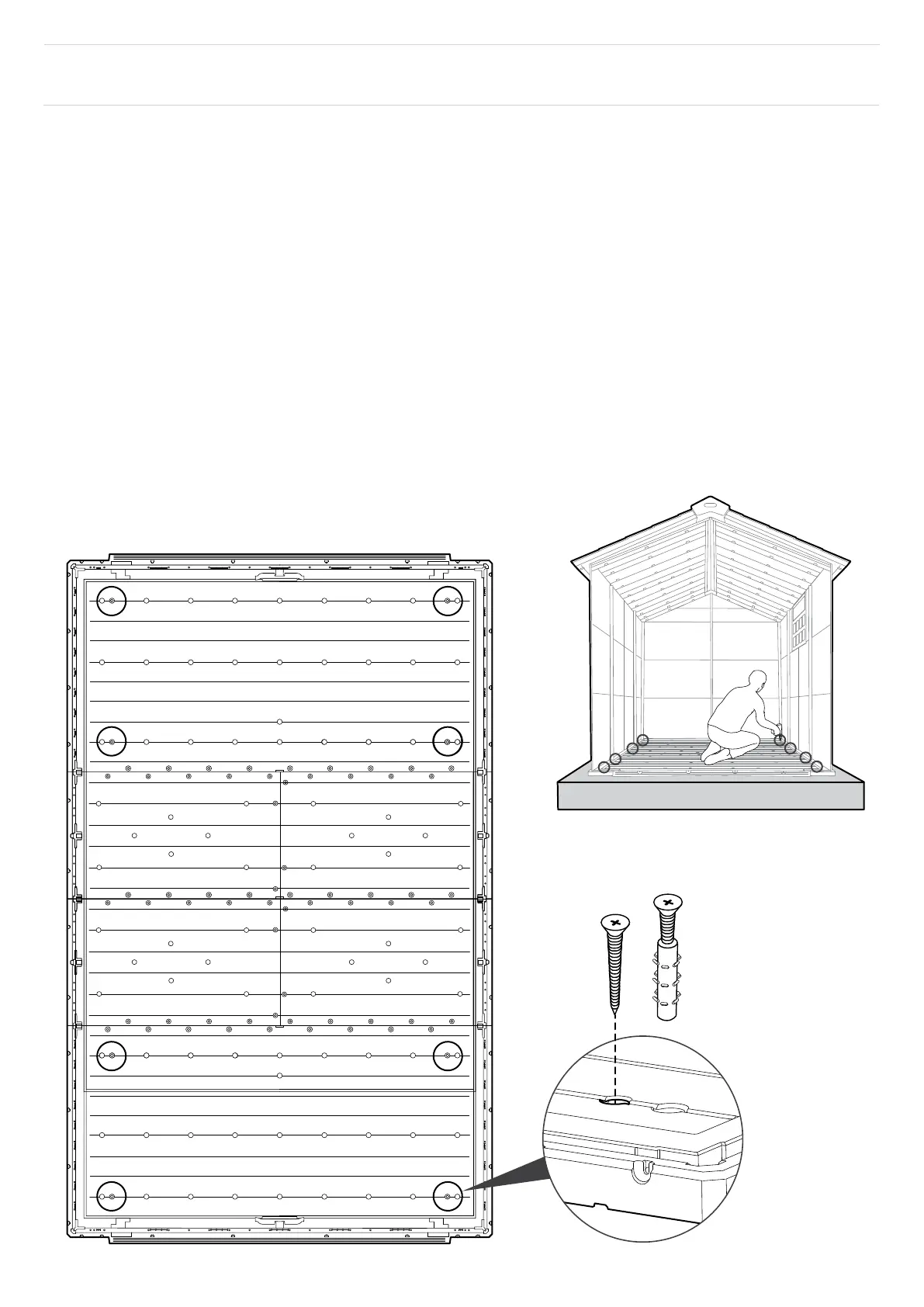 Ancorare la casetta alle fondamenta forando il pavimento nelle posizioni indicate e applicando apposite viti (viti non incluse).