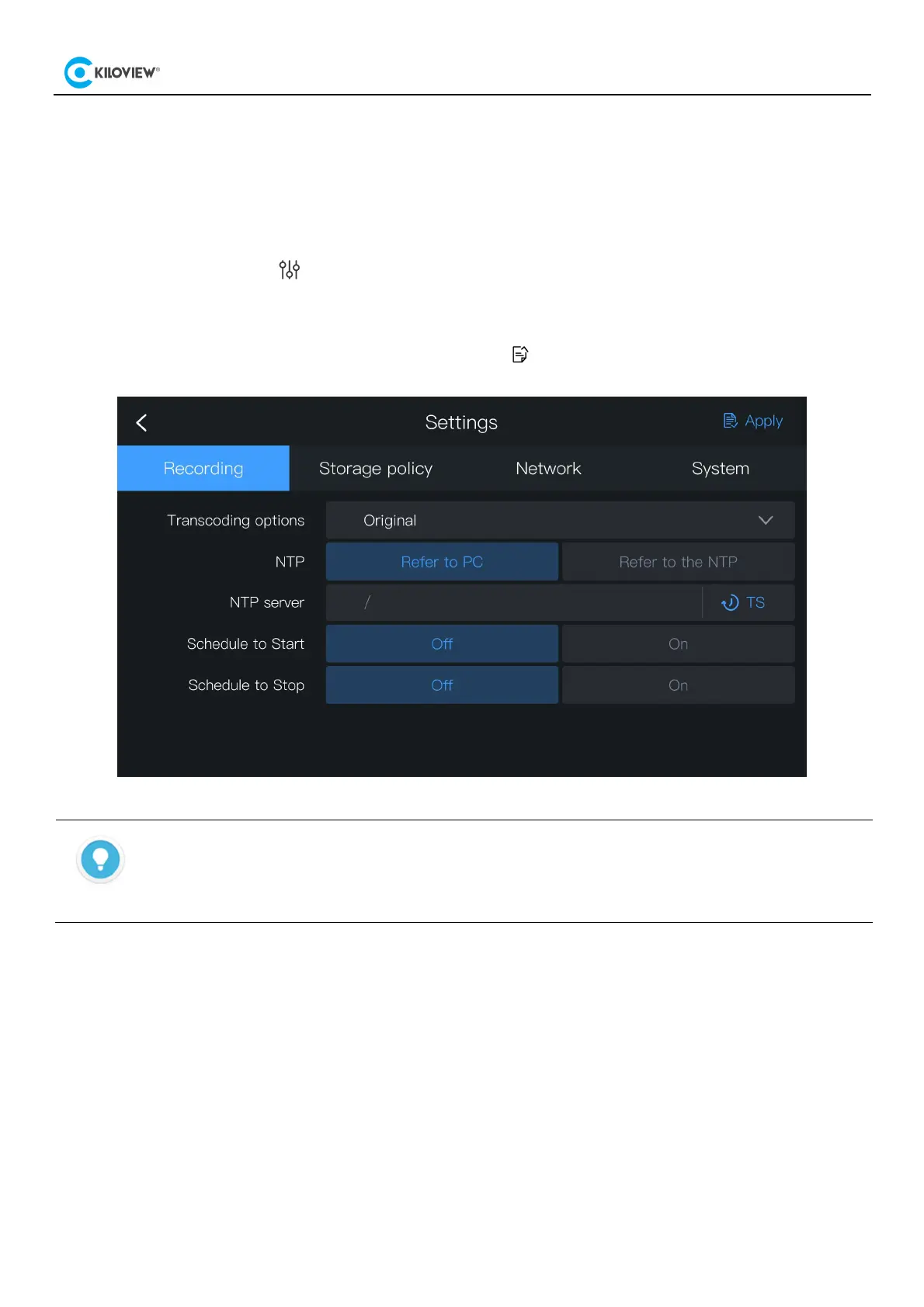recording time periods. As shown in the figure below, click" Apply" in the upper right corner to save and