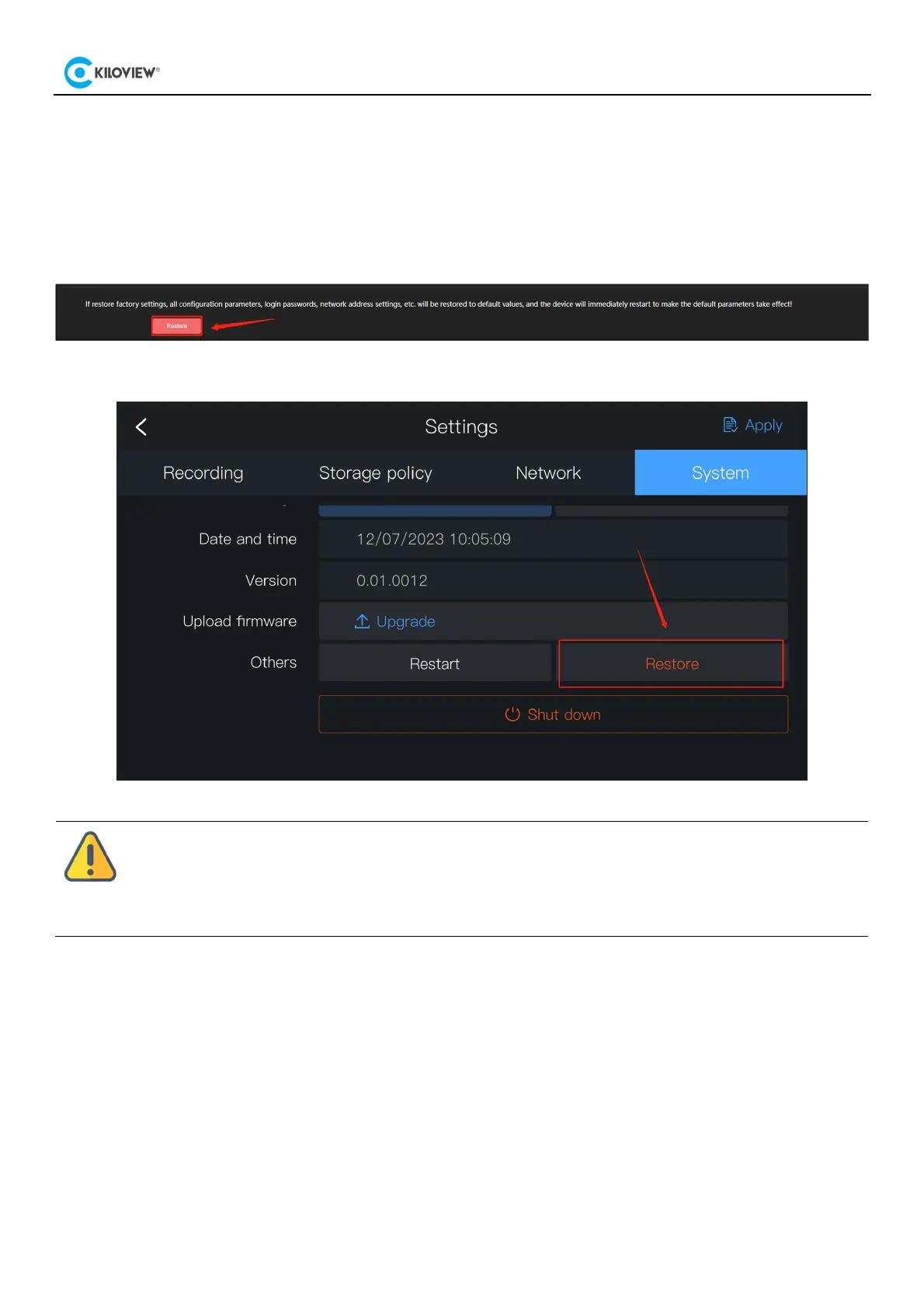 All recording parameters, system settings, etc. will be restored to factory default parameters.
