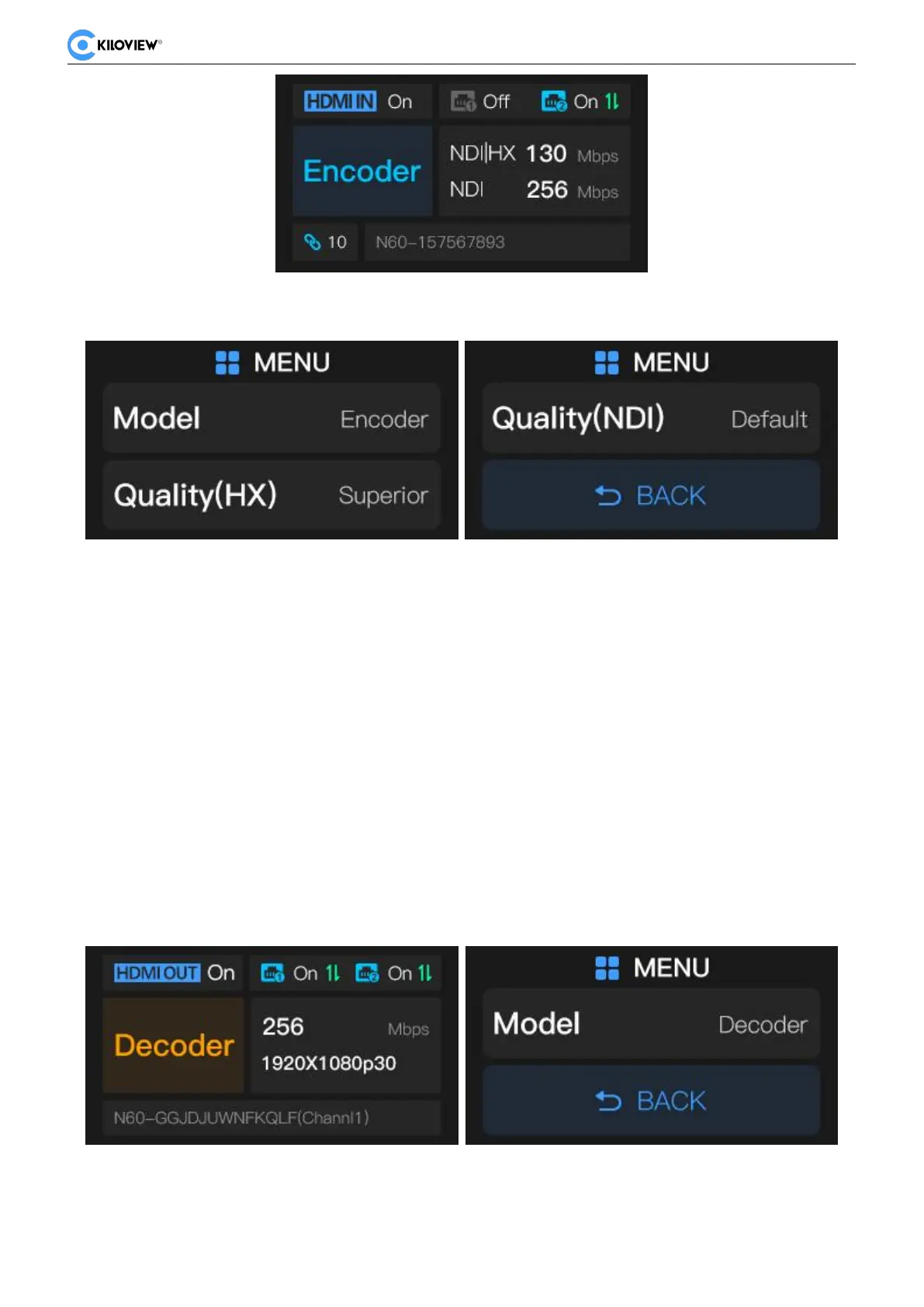Decoder, indicates the current status is decoding mode. “HDMI OUT” On, indicates the HDMI output