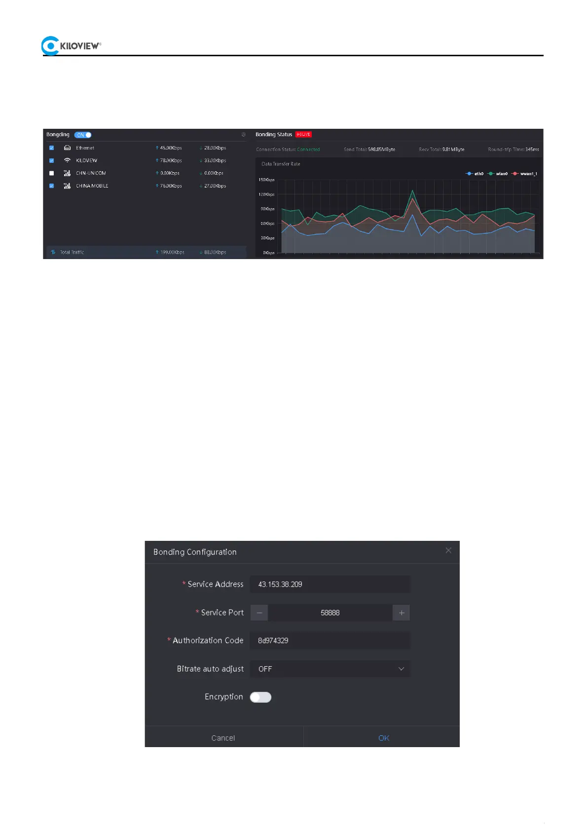 To use the bonding feature, you need to enable the bonding service switch and configure the IP address, port number,