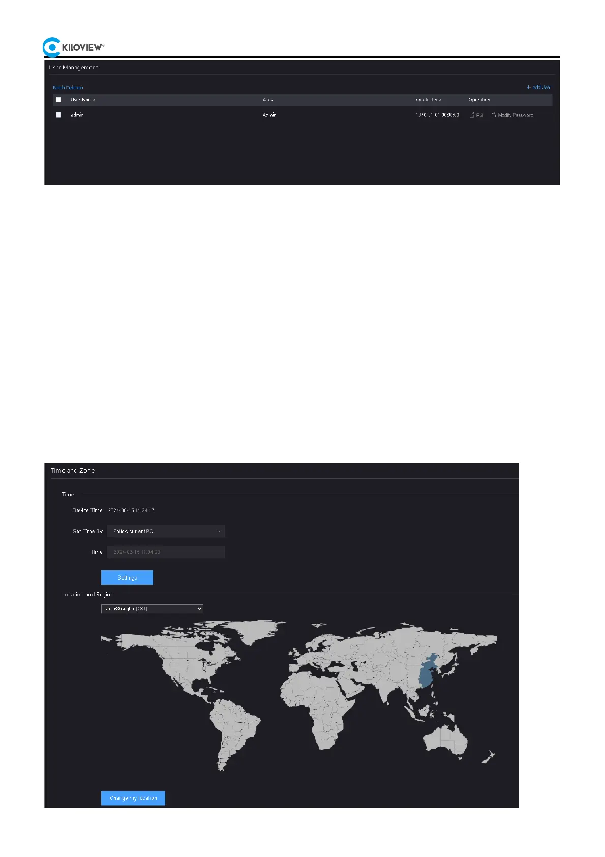 Navigate to the top navigation bar, click on "Settings" -> "Time and Zone" page to modify the system time and region of