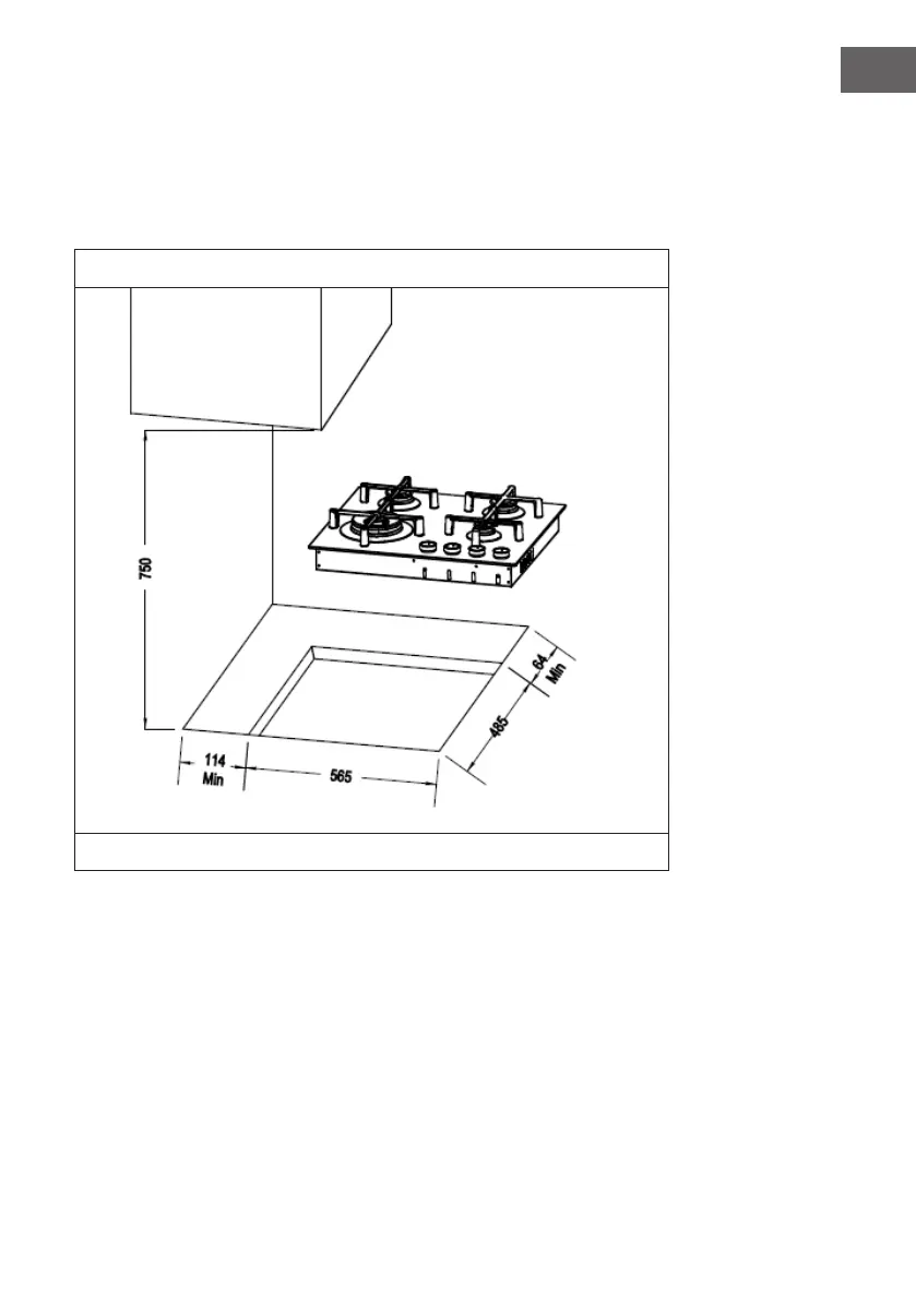 Mindestabstand von 750 mm von Schränken oder Hauben zur Oberseite des