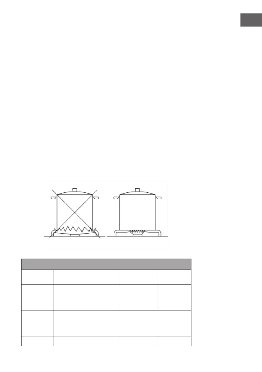 • Use proper pan size (with at bottom only) for each burner (see the table