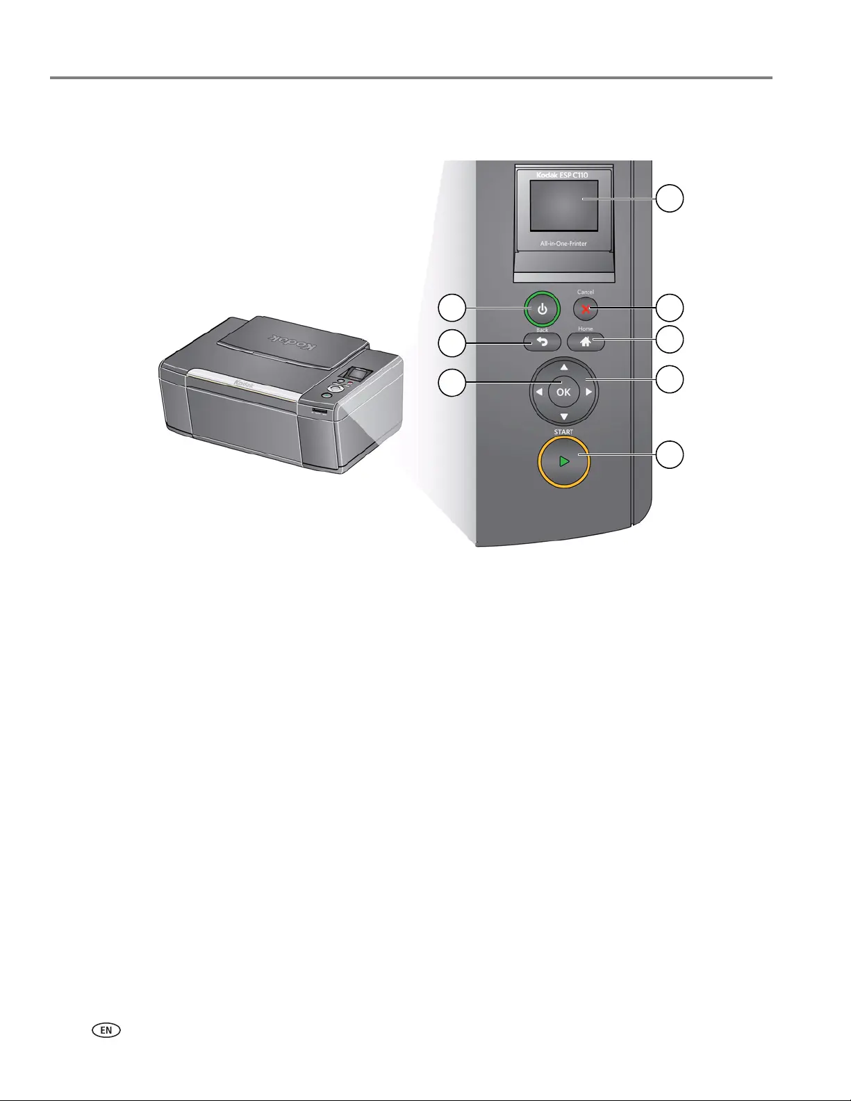 5 Start button Begins copying, scanning, printing, maintenance task, and file