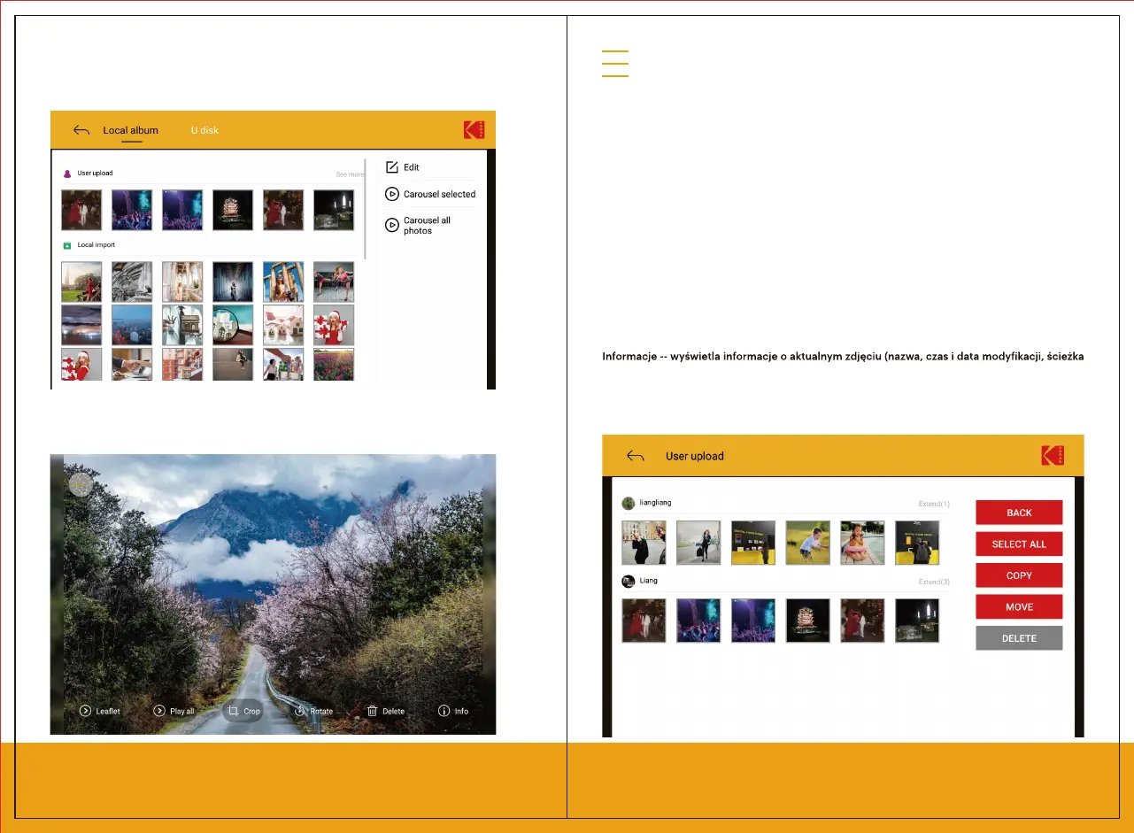 kliknięciu na zdjęcie: Rozłóż / Odtwórz wszystkie zdjęcia / Kadruj / Obróć / Usuń / Informacje