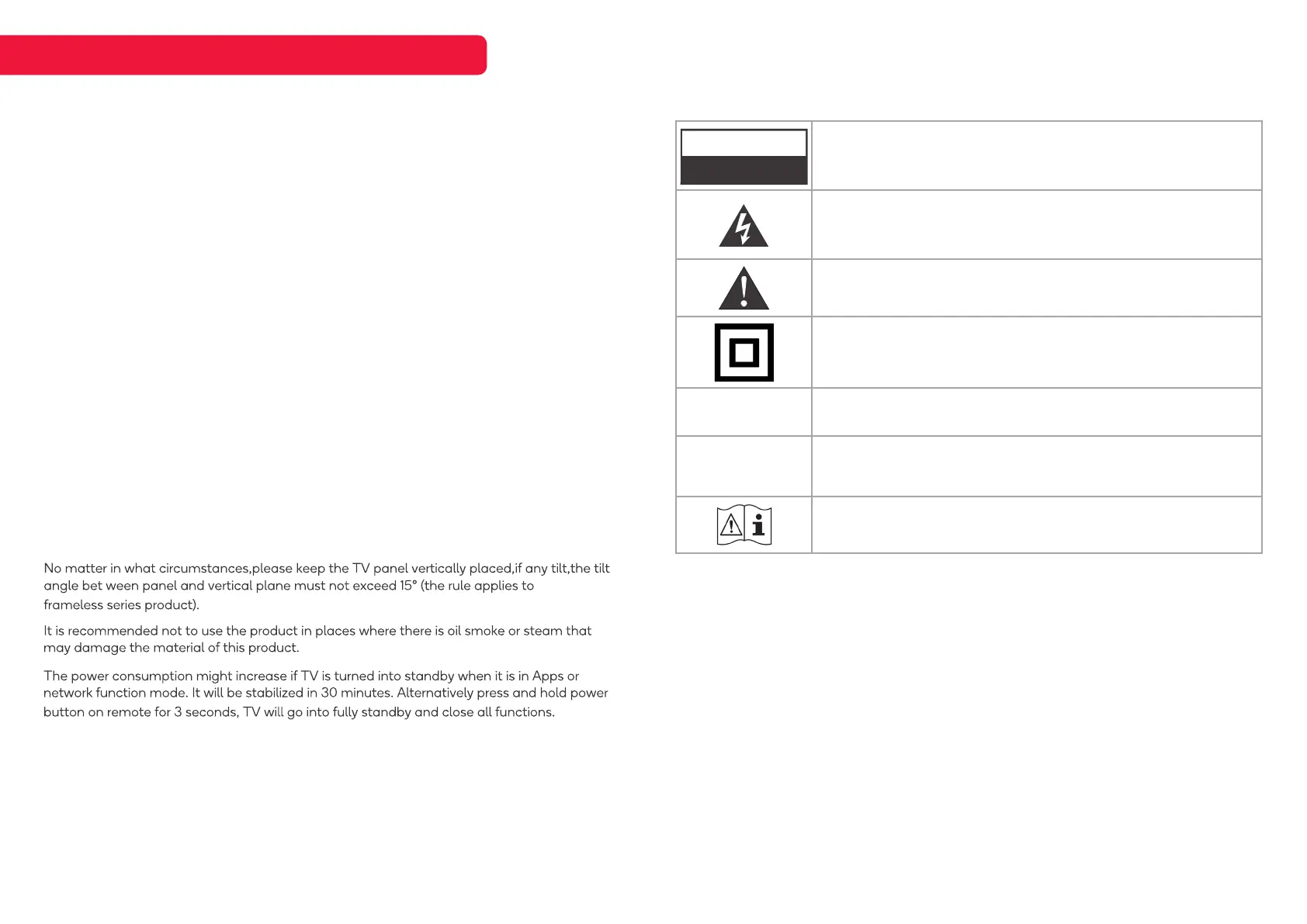 Refer to the table below as a guide to the symbols and warnings which may be on your TV.