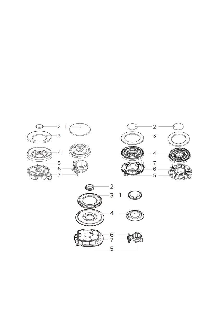 2. Position the burner lid (1, 2, 3) onto the flame spreader (4) so that the retaining pins