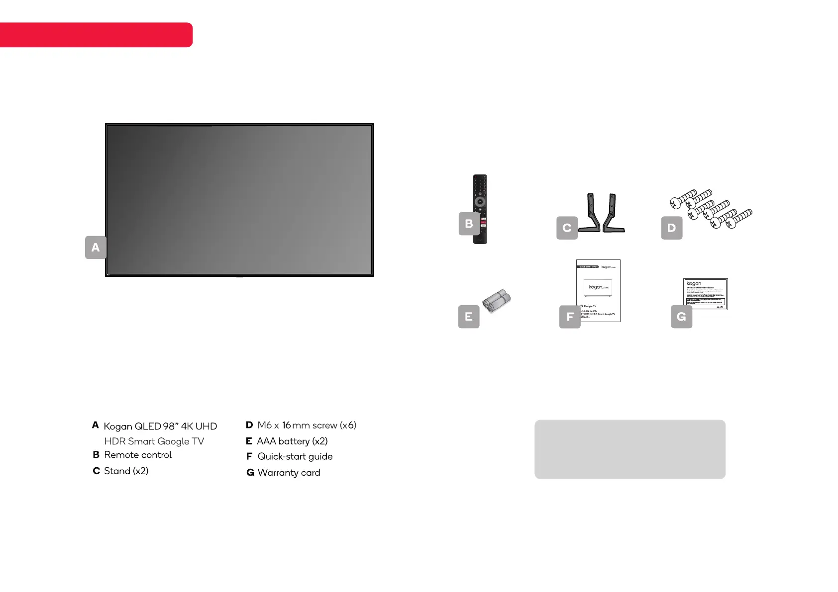 Bekijk gratis de handleiding van Kogan KAQLED98XQ98JSTA, stel vragen en lees de antwoorden op veelvoorkomende problemen, of gebruik onze assistent om sneller informatie in de handleiding te vinden of uitleg te krijgen over specifieke functies.
