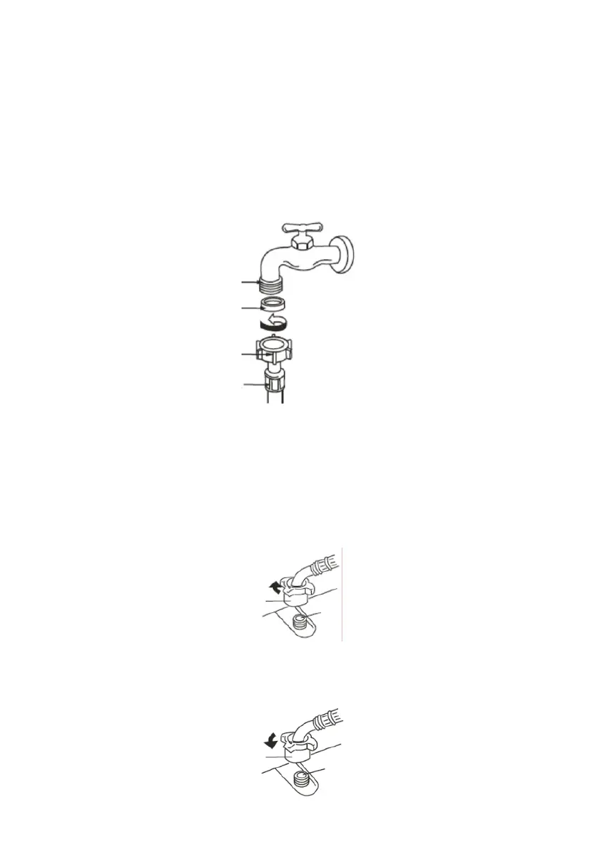3. Attach straight end of the hose to the tap. Tighten the coupling nuts securely by