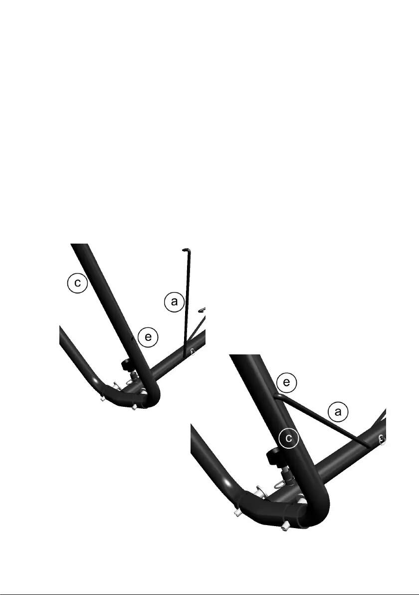 Sollevate la staffa (a), ed inseritela nel foro apposito (e) nella gamba (c).