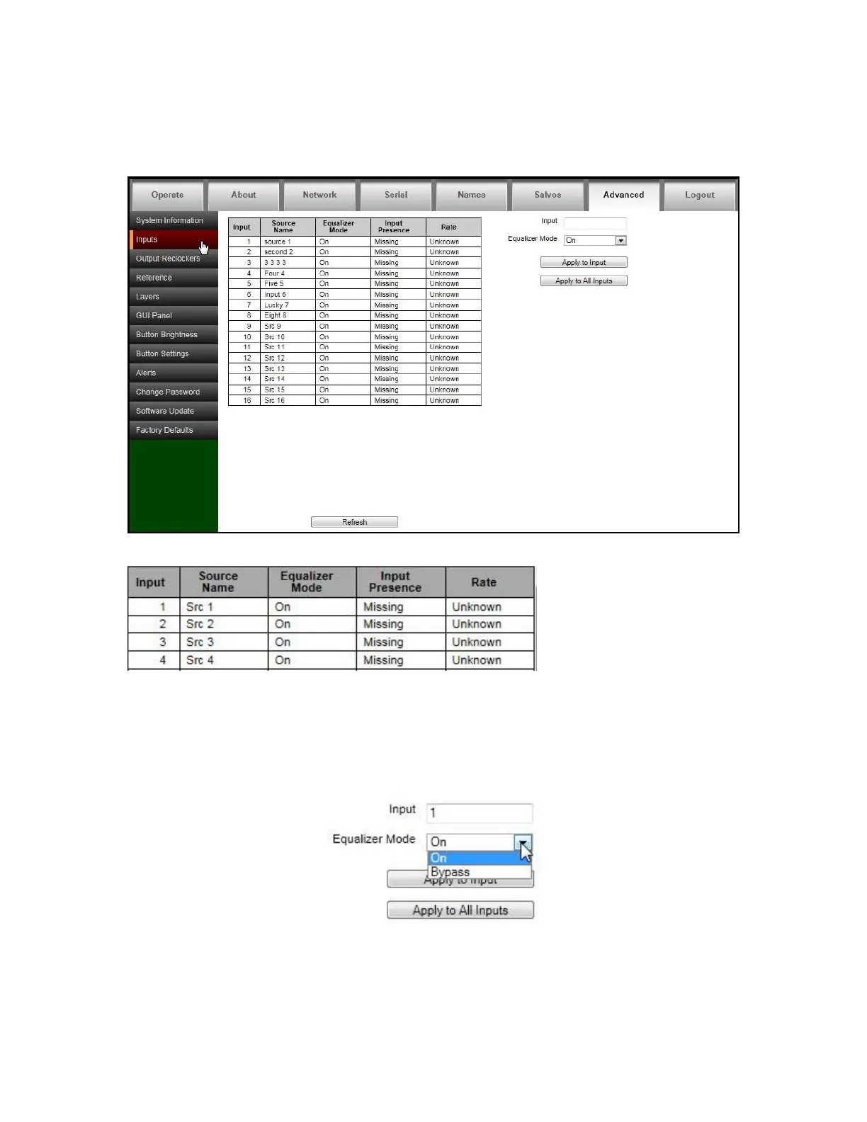 Select “Inputs” for access to cable equalizer adjustments and input signal status.