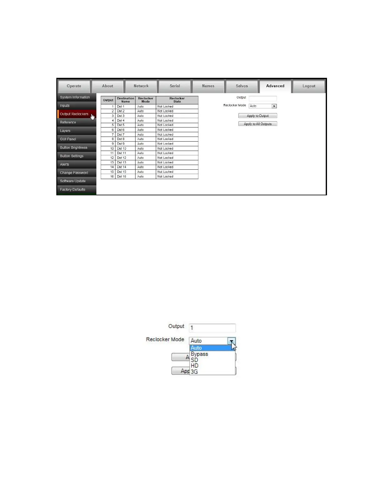 To set the reclocker mode of all outputs, select the reclocker mode from the dropdown list