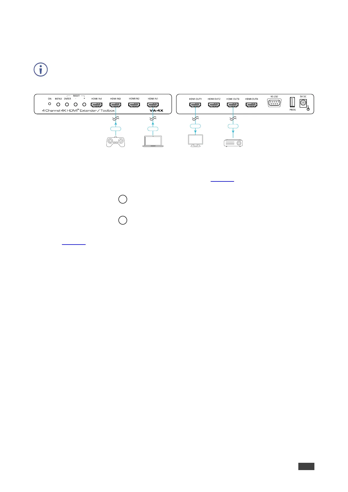 2. Connect up to four HDMI acceptors (for example, display, projector) to HDMI OUT