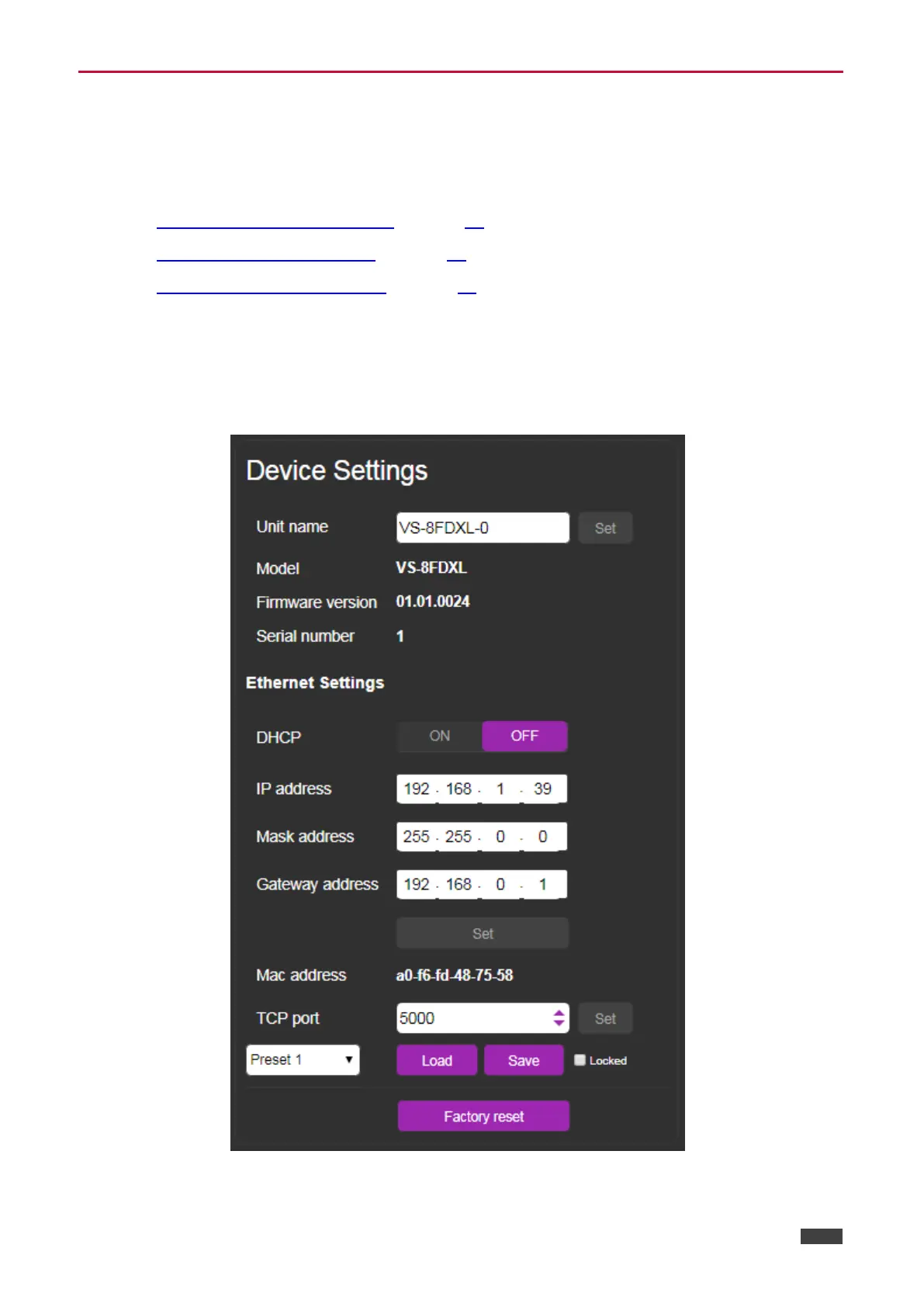 The Device Settings Web page shows the device details, such as the unit name (changeable),