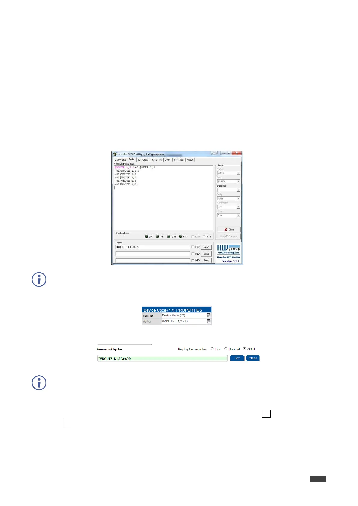 out 1 from HDMI input 2 (ROUTE 1,1,2), is entered as follows: