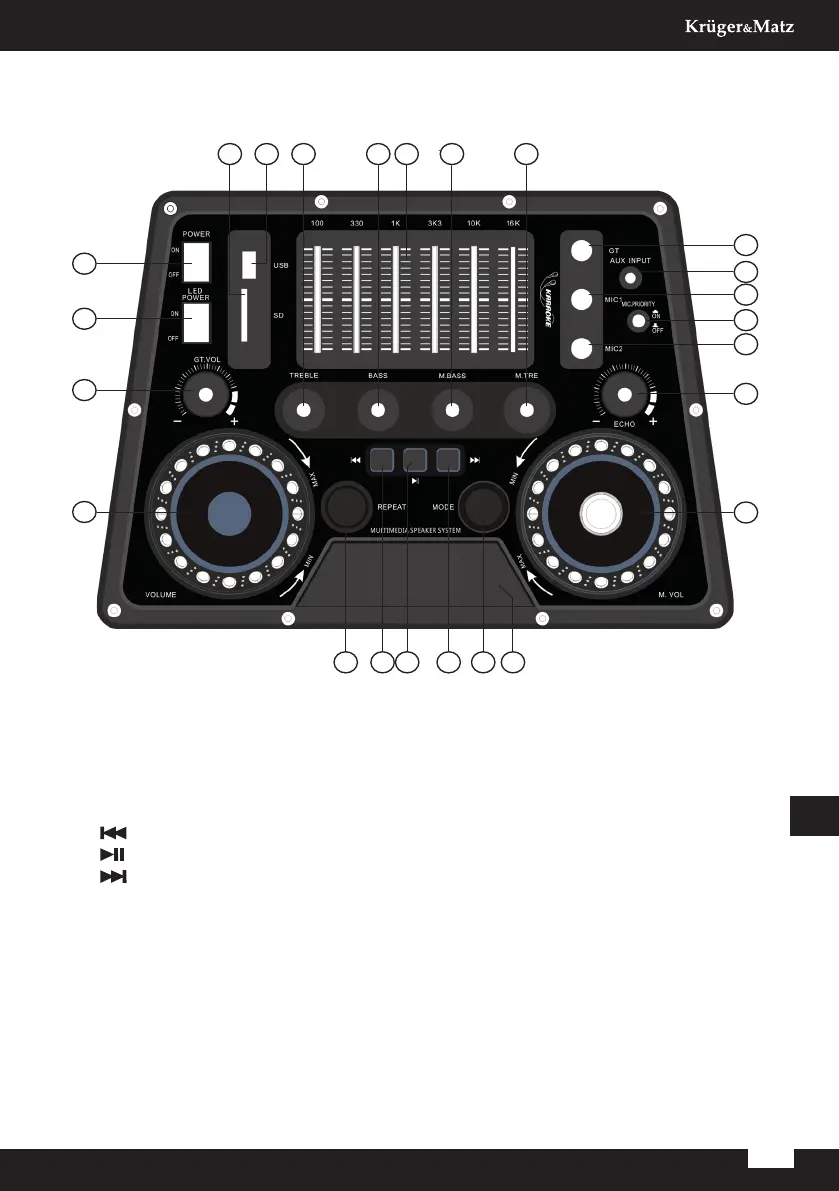 18. Pokrętło M. TREBLE: Regulacja tonów wysokich mikrofonu