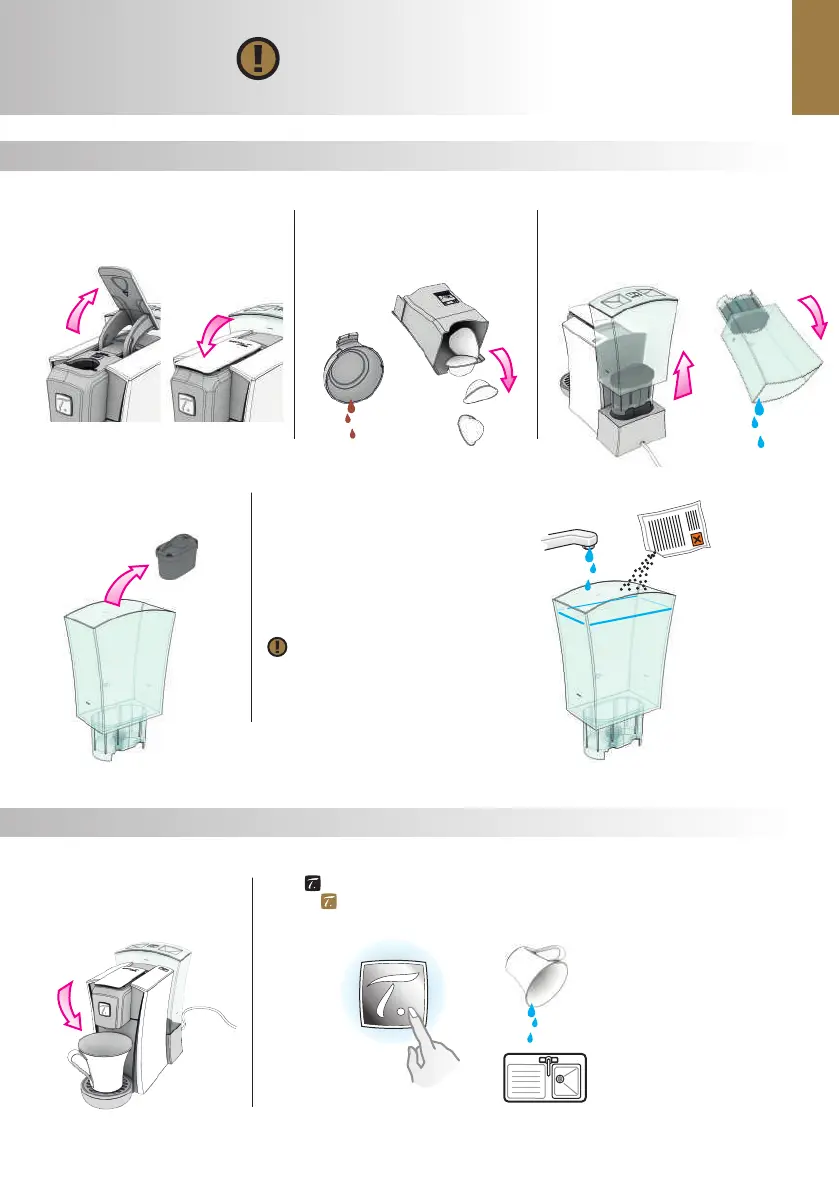 Taste drücken, bis der Tank leer ist und Entkalker wegschütten.