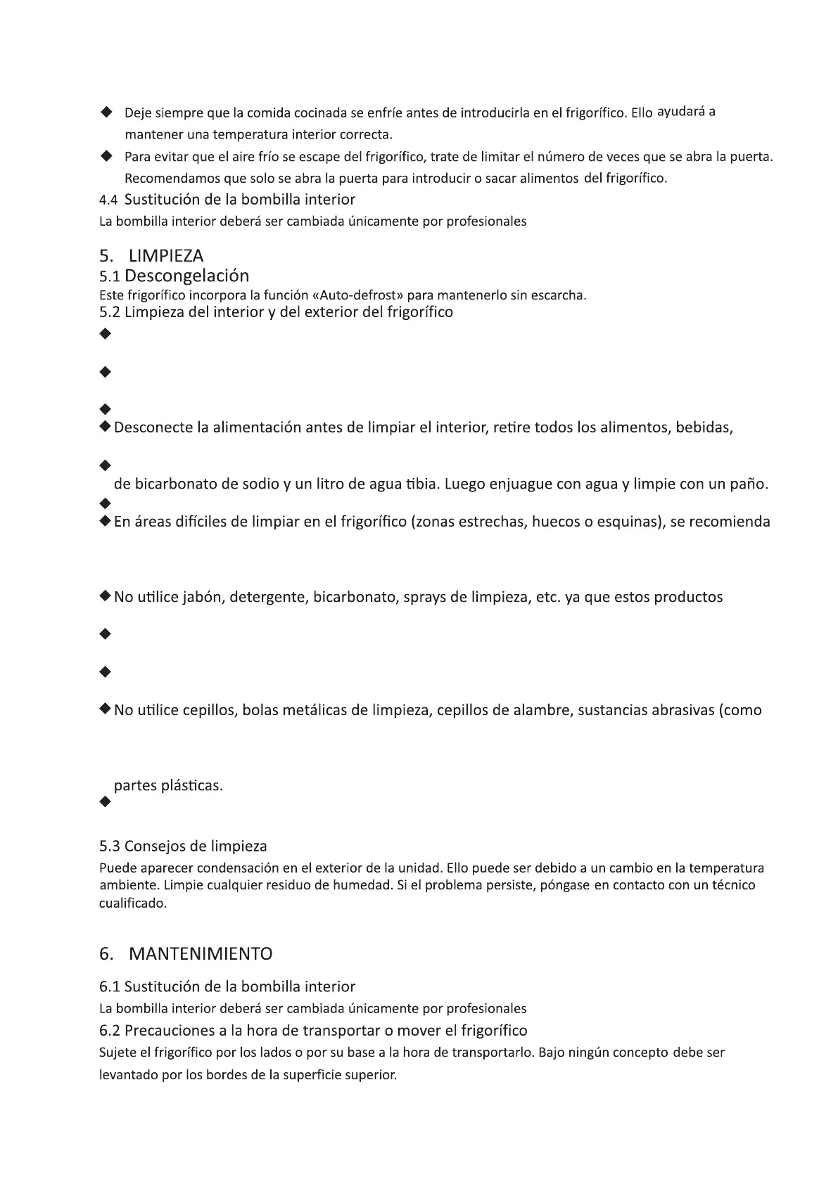 hirviendo, acido o productos alcalinos, que pueden dañar al interior y el exterior del frigorífico.