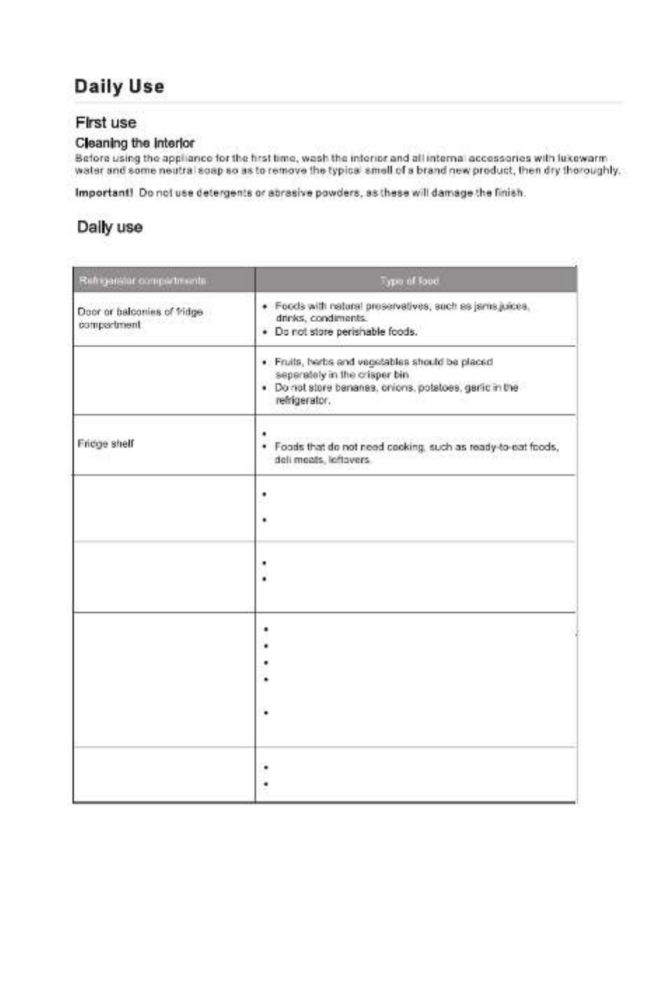 Position different food in different compartments according to be below tablePosition different food in different compartments according to be below table