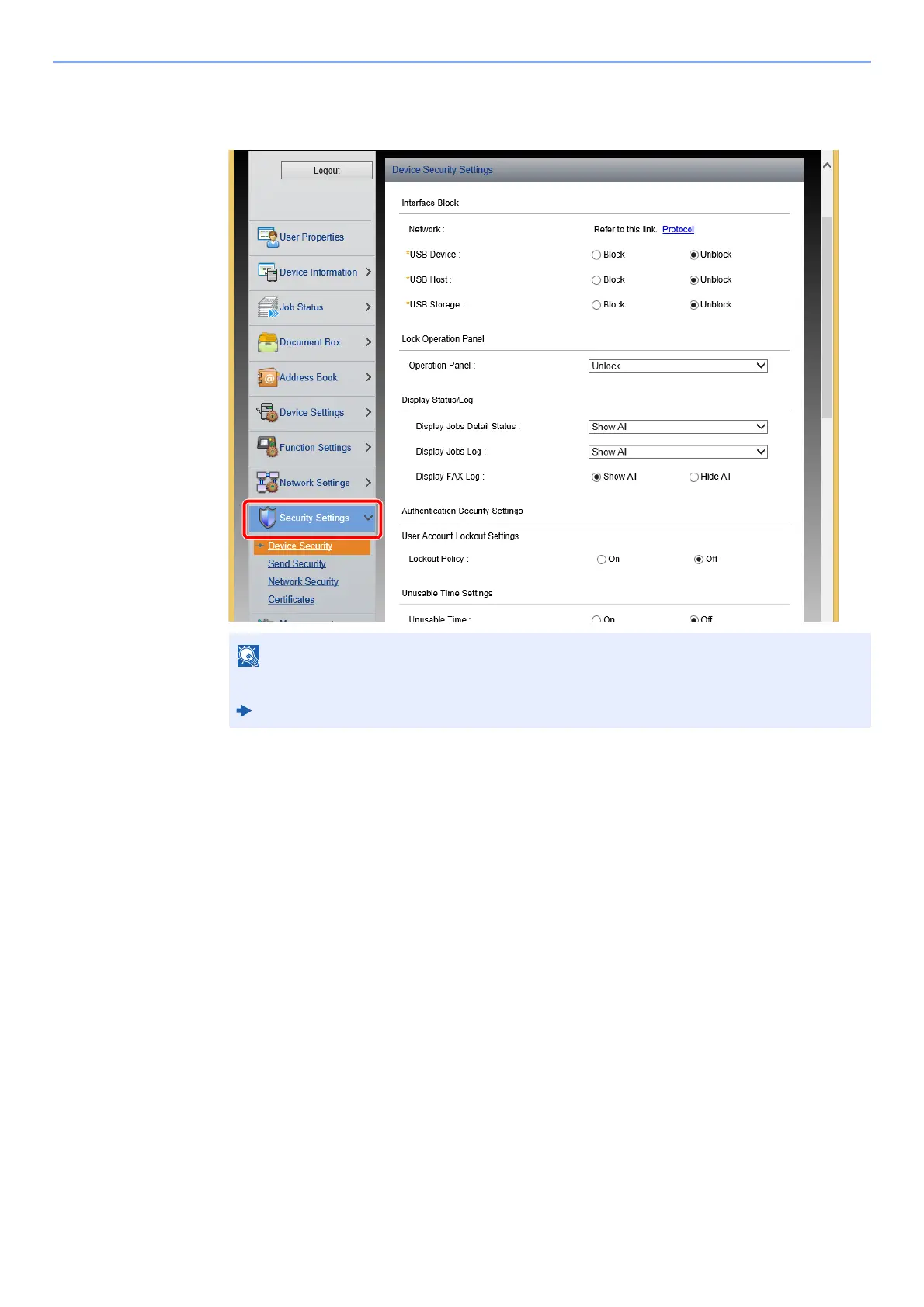 From the [Security Settings] menu, select the setting you want to configure.