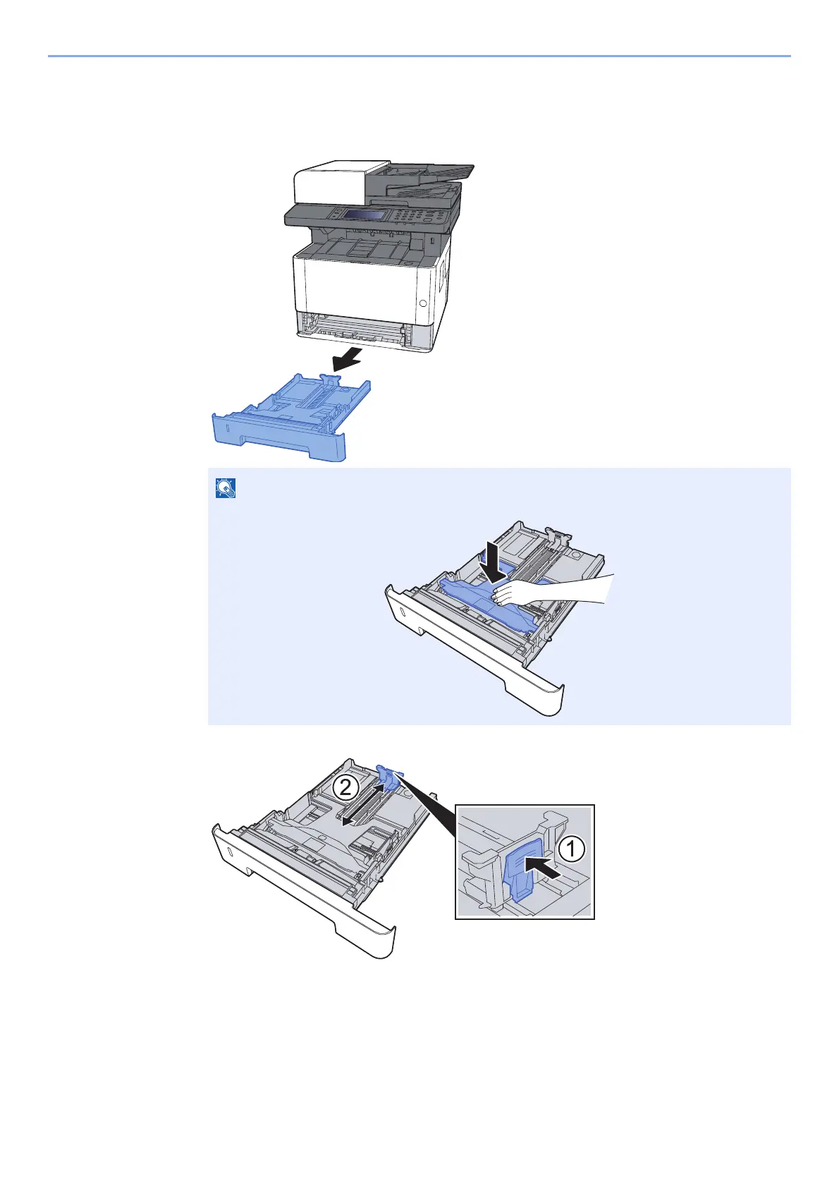 Load paper in the cassettes. The procedures here represent the cassette 1.
