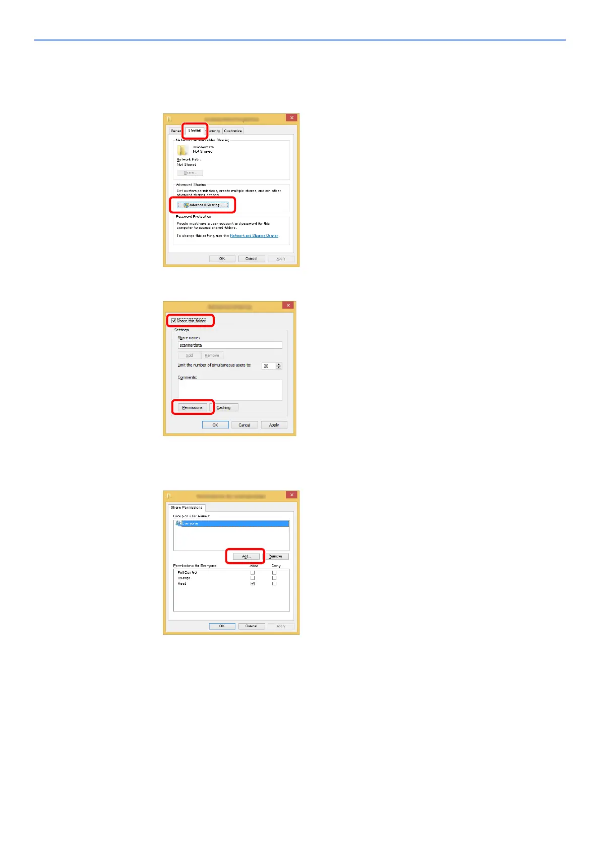 1 Right-click the "scannerdata" folder, select [Property], and click [Sharing] and