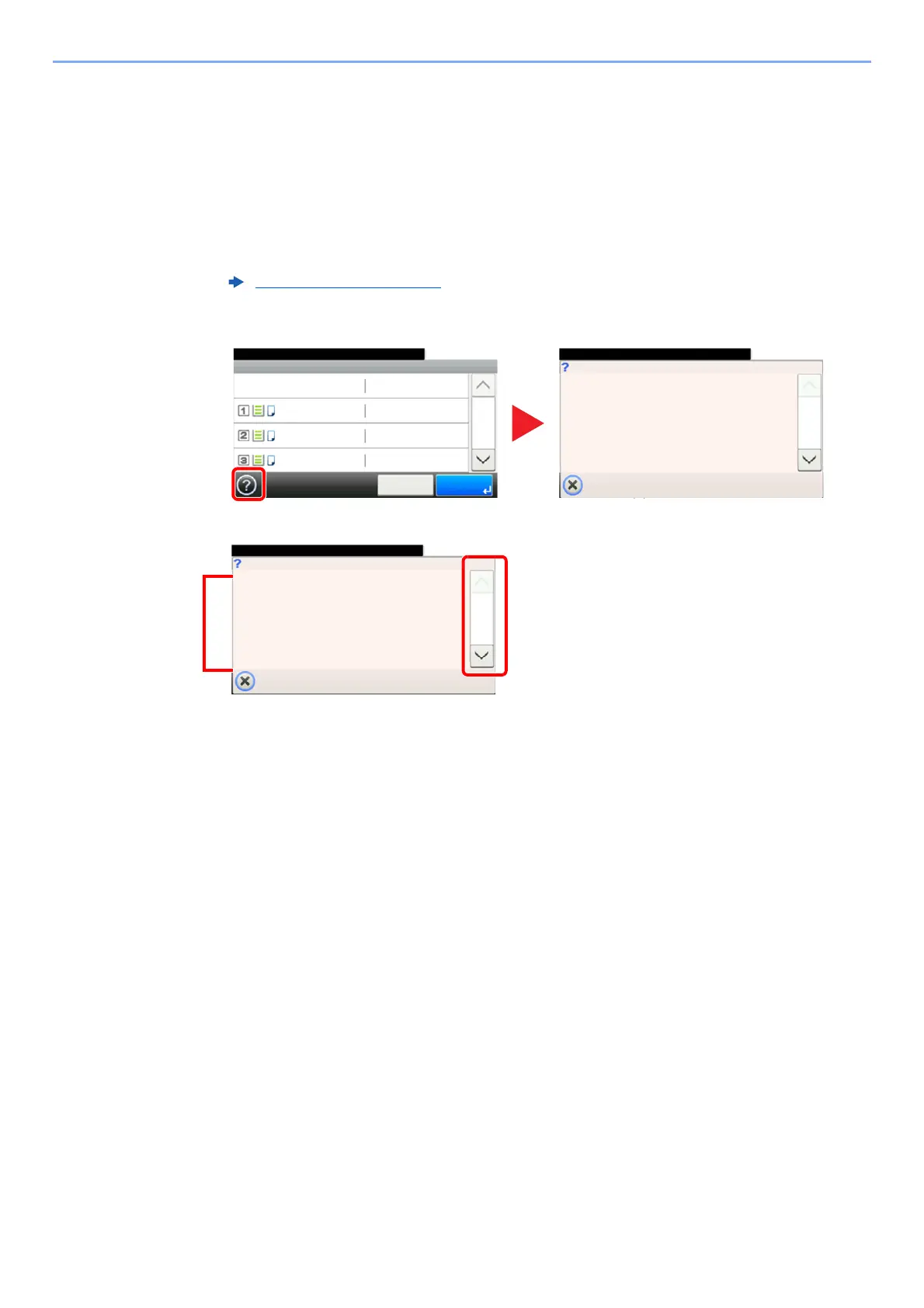Als [?] (hulp) wordt weergegeven op het aanraakscherm, dan kunt u erop drukken om het hulpscherm te openen. In het