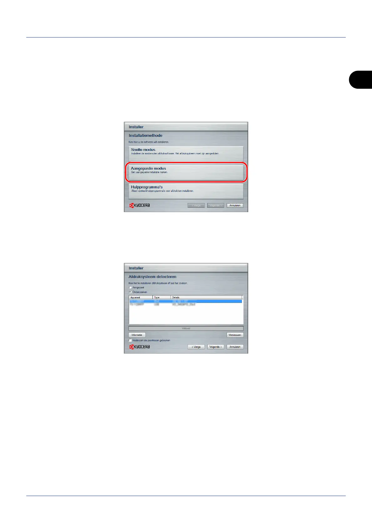 Gebruik de Aangepaste modus als u de printerpoort op wilt geven en de te installeren software wilt selecteren.