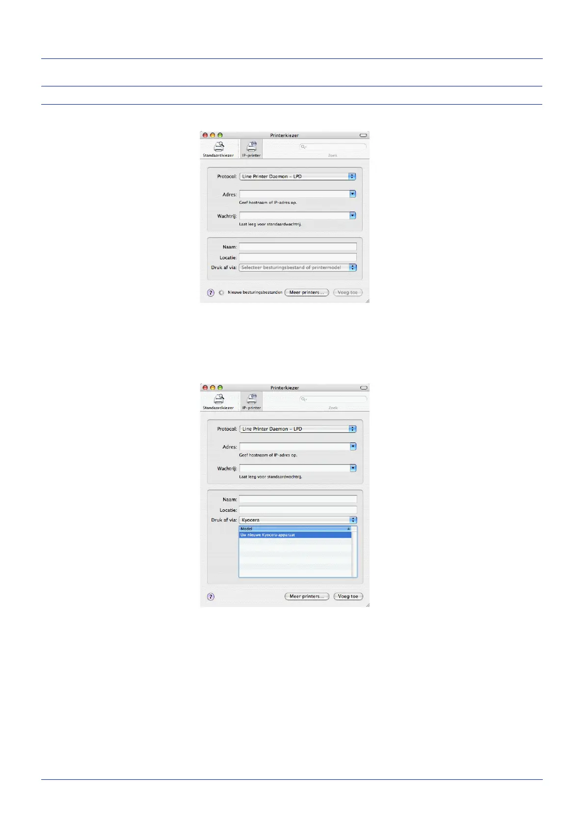 Voor een Bonjour-aansluiting, klikt u op de standaardicoon en selecteert u de printer waarvoor Bonjour verschijnt