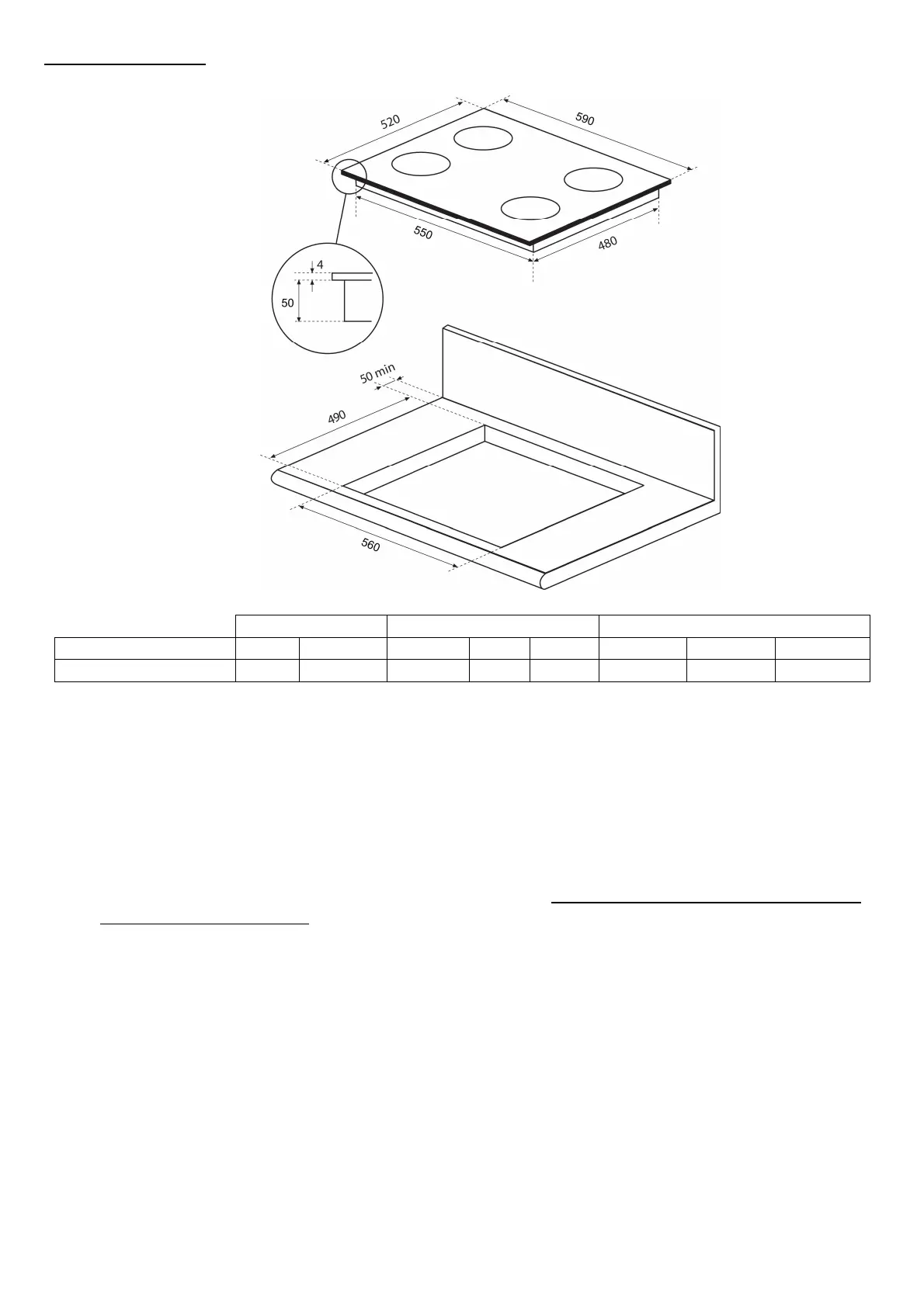 • Ensure that there is a distance of 50 mm between the hob and the wall or sides.