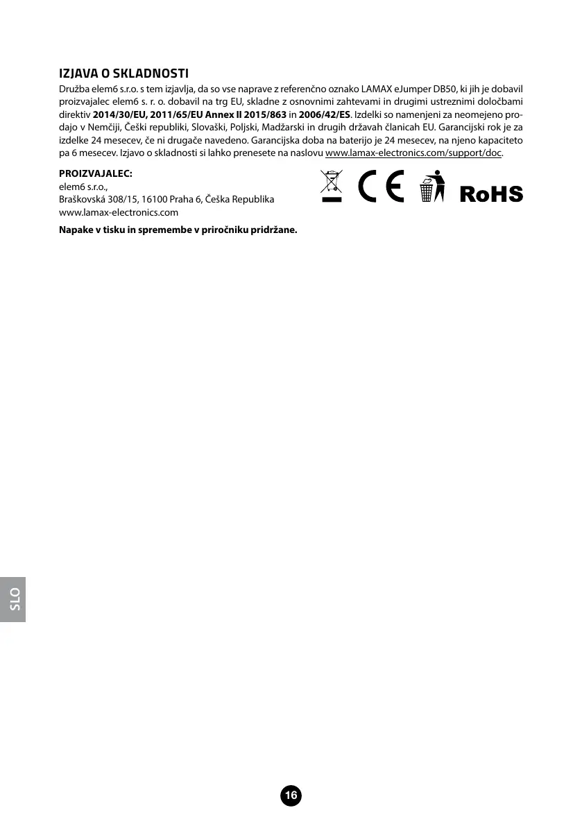 Družba elem6 s.r.o. s tem izjavlja, da so vse naprave z referenčno oznako LAMAX eJumper DB50, ki jih je dobavil