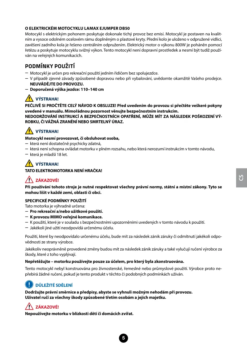 Tento motocykl nebyl konstruována pro živnostenské, řemeslné nebo průmyslové použití. Výrobce proto ne-