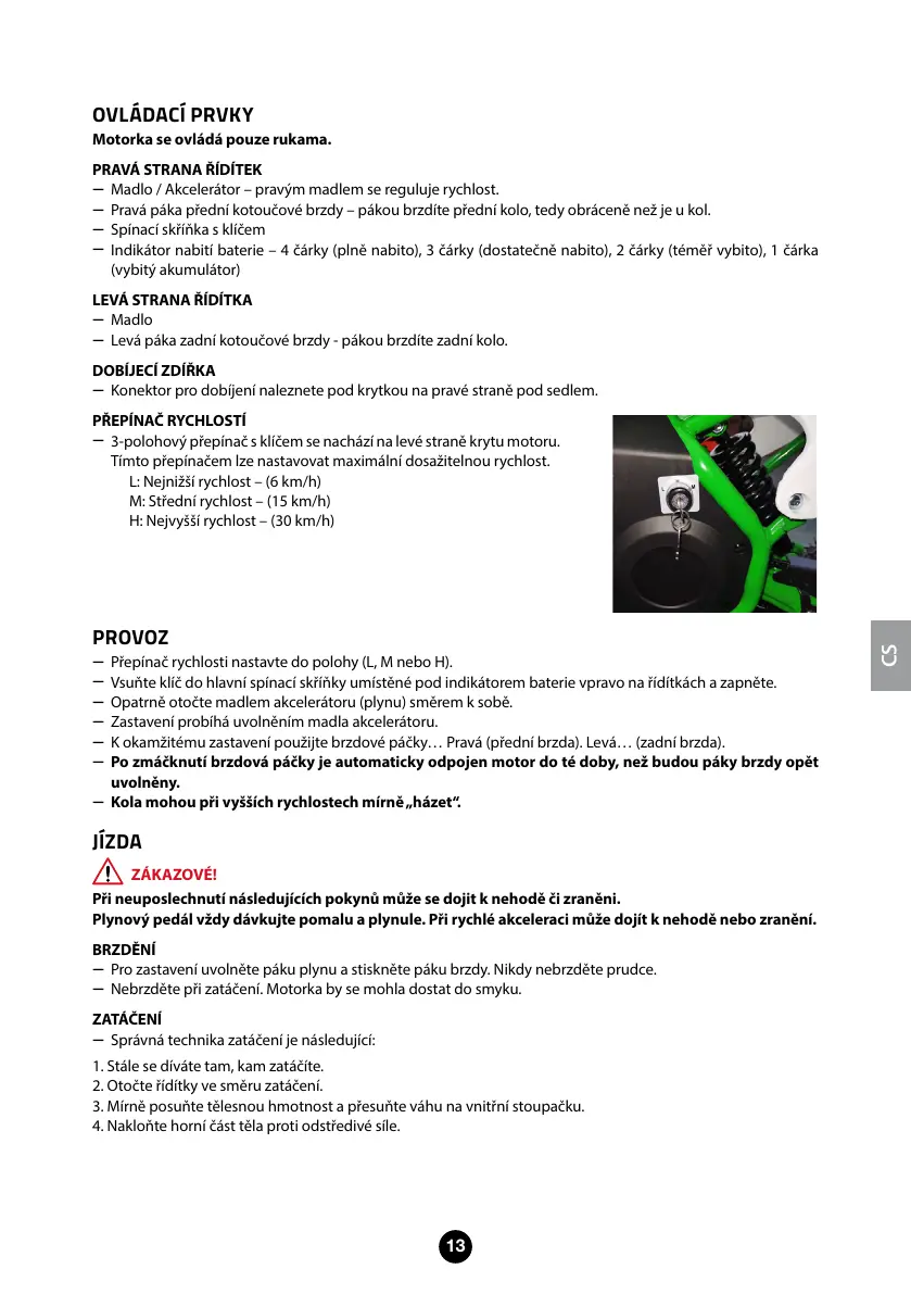 K okamžitému zastavení použijte brzdové páčky… Pravá (přední brzda). Levá… (zadní brzda).