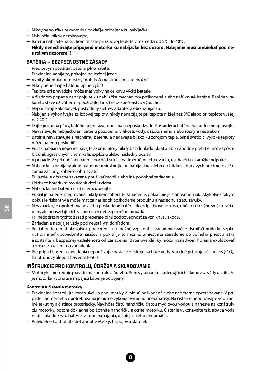 Nikdy nepoužívajte motorku, pokiaľ je pripojená ku nabíjačke.
