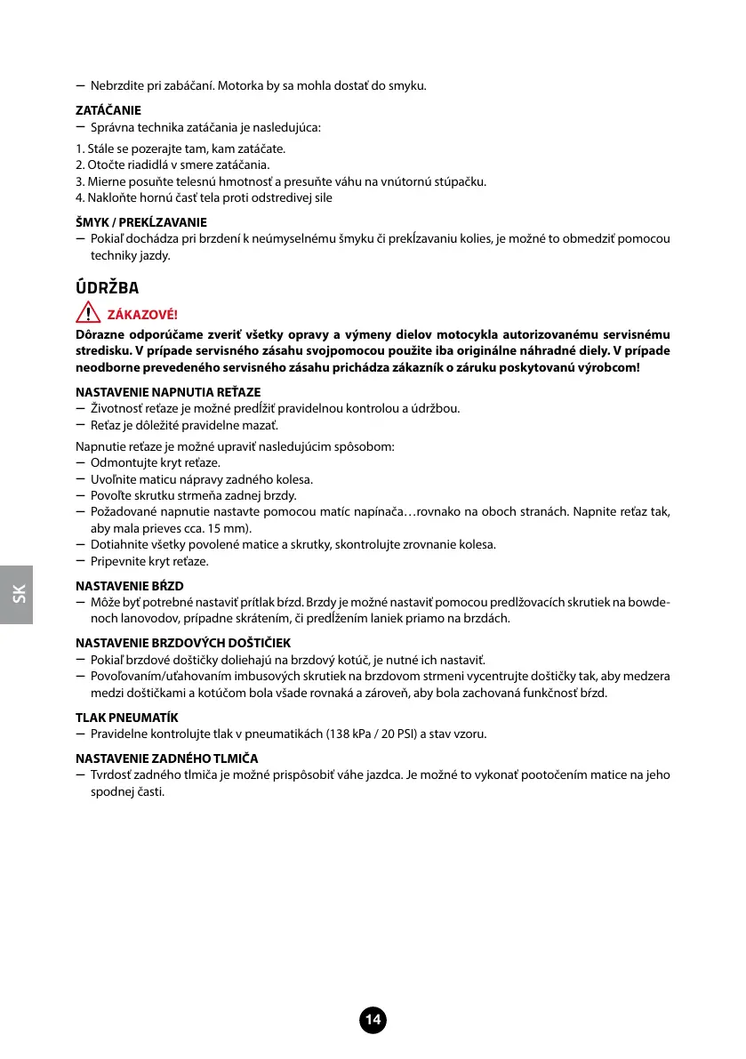 Dôrazne odporúčame zveriť všetky opravy a výmeny dielov motocykla autorizovanému servisnému